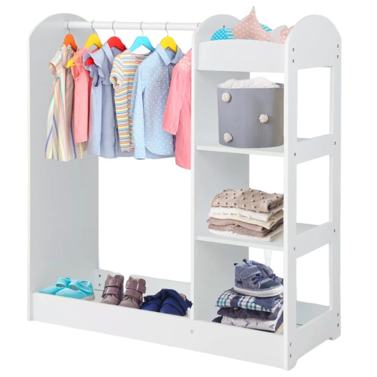 Детска Стойка за Дрехи с Огледало GINGER HOME – Отворен Детски Гардероб с Рафтове и Закачалки, Бял, 94x38x100 см