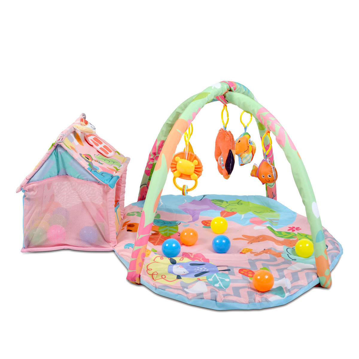 Тя е подходяща за бебета от 0-месечна възраст. Разнообразните цветове ще стимулират сетивата на детето, което ще се забавлява със своите нови приятели- играчките, които могат да се окачат по грифовете. В комплектът са включени още: 30 топки и сваляеми грифове.