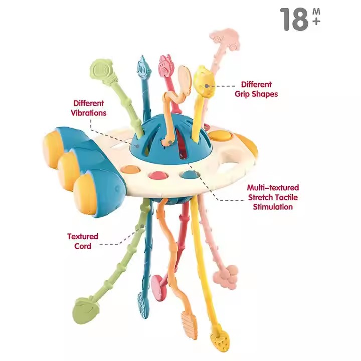 Сензорната играчка UFO стимулира сетивата, фината моторика и координацията око–ръка чрез забавна и образователна игра. Изработена е от мек, безопасен силикон, подходящ за нежните ръчички и венци на детето.