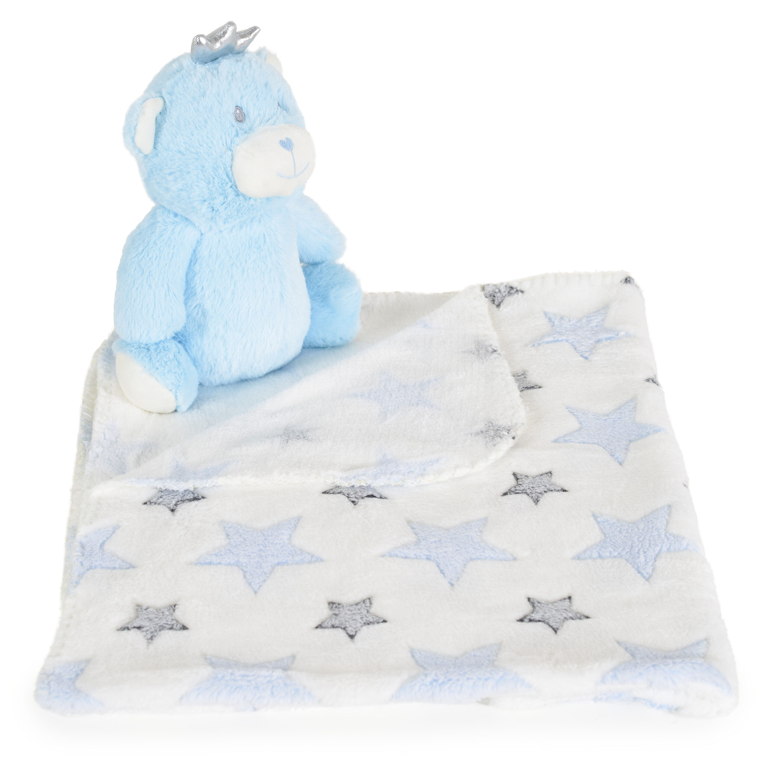 Меко и топло бебешко одеяло с дизайн на звезди и забавна, пухкава играчка мече.