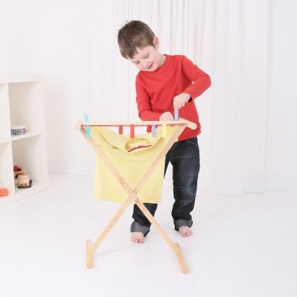 Идеалното място за всеки малчуган, на което да изсуши чистите си дрехи, е този ярко оцветен дървен простор. Има достатъчно пространство, без значение дали става въпрос за негова дрешка или за тази на някоя кукла. Насърчава творчеството и въображението. Играчката е изработена с безопасни материали. Боите са на водна основа.