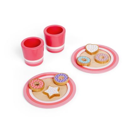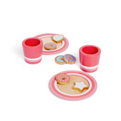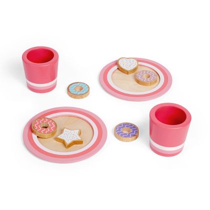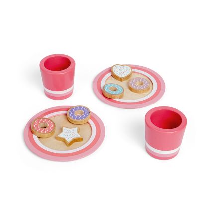 Комплектът се състои от 6 дървени бисквити, 2 чинии и 2 чаши. Да имитират възрастните помага на децата да придобият самочувствие и да се научат на жестове и речник, които могат да използват в ежедневието. Заниманията с играчката ще развият социалните уменията и въображението, насърчават също и ролевата игра.