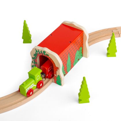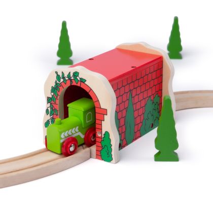 Чудесно допълнение към всеки комплект с релси и аксесоари! Тунелът разделя града от предградията, за да направи играта още по-реалистична и забавна. Малките машинисти ще могат да бутат влакчетата си през червения тунел и да гледат как излизат от другата страна. Той е съвместим с релсите на повечето брандове. Изработен е от дърво и е боядисан с бои на водна основа.