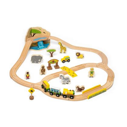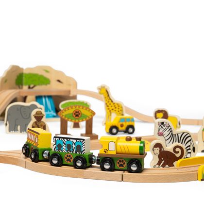 Готови ли сте за едно сафари приключение? Какви ли диви животни ще забележите по пътя? Нахалната маймуна или гигантския жираф? Може би дори ще чуете рева на лъва! Този комплект от 38 парчета включва висококачествени дървени релси, влак, диви животни, включително слон, зебра и маймуна, знаци, дървета и други! Играта с комплекта насърчава творческото мислене, въображението и координацията, развива грубите и фините двигателни умения и координацията. Комплектът е съвместим с релсите и аксесоарите и на други големи марки. Изработката му е от висококачествени и напълно безопасни материали.