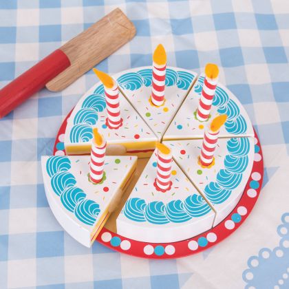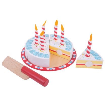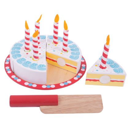 Честит рожден ден! Издухай свещичките на вкусната торта на Bigjigs! Тя е изработена от дърво и може да бъде разрязвана многократно, тъй като парчетата ѝ са свързани помежду си с велкро лепенки. Към нея има и дървено ножче и 6 свещички, които могат да се слагат и махат от тортата. Играта с нея е полезна за фините моторни умения, математическите такива и ролевата игра. Всички части от комплекта са боядисани с нетоксични бои.