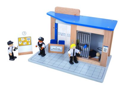 Полицията на Bigjigs е много заета да залавя лошите и да ги вкарва зад решетките. Използвайки мястото за улики, където се събират всички доказателства, полицията успя да разбере кои са лошите и да се надпреварва с тях, за да ги хване, преди да се измъкнат. След като бъдат заловени, те се отвеждат обратно в управлението и се затварят. Дървеното полицейско управление предлага безкрайни сценарии на игра и се предлага в комплект със 7 аксесоара – 2 бюра, 2 стола, легло, място за улики и полицейски мотор. Вратите на управлението са плъзгащи се. Изработката на комплекта е от висококачествени и напълно безвредни материали.