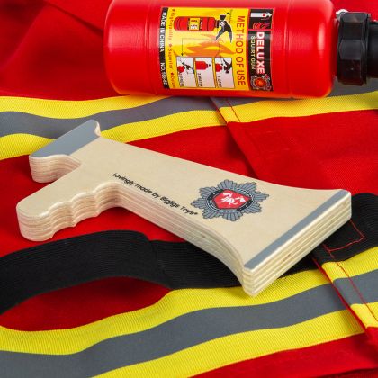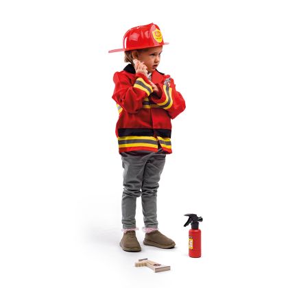 Този детски комплект дрехи за обличане се предлага с яркочервено пожарникарско яке с раирани ръкави и значка, дървен пожарогасител, уоки токи радио и мегафон.