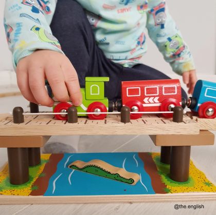 Допълнителен аксесоар за игра към дървени влакчета с релси – Въжен мост със река и крокодил от Bigjigs е фантастично допълнение към всяка дървена железопътна система. Комплектът включва: Въжен мост с река отдолу, който позволява на влаковете да преминават през него, създавайки нови маршрути и предизвикателства. Крокодил, който добавя допълнителен елемент на приключение и забавление, като децата трябва да се уверят, че не безпокоят крокодила по време на преминаването. Тази играчка насърчава креативната игра и измислянето на истории, като предоставя на децата нови възможности за разказване на приключения с влаковете. Въженият мост създава нови възможности за игра и помага за развиване на въображението и социалните умения. Комплектът е съвместим с другите големи марки за дървени влакчета с релси и е изработен от висококачествена FSC® сертифицирана дървесина, осигуряваща отговорно производство. Играчката отговаря на европейските стандарти за безопасност, което гарантира, че е безопасна и здрава за използване.