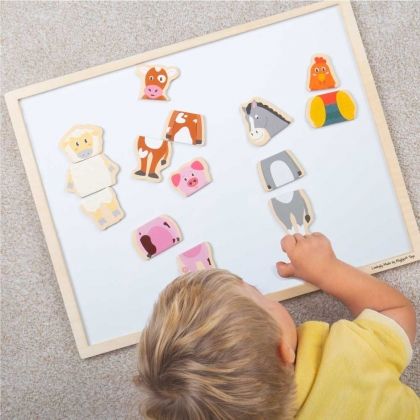 Насърчете креативността, фината моторика и умението за решаване на проблеми с новата серия магнитни игри от Bigjigs. Съединете правилно магнитните части, за да направите различни животни от фермата или ги разбъркайте, за да създадете невероятни такива. Играта с частите може да бъде трудна, но много забавна задача. С тях може да се играе върху магнитна дъска или на хладилника. Изработката е от висококачествени и безвредни материали.