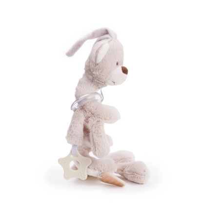 Плюшената дрънкалка меченце е във формата на спирала и може да бъде лесно закачена за креватчето или количката, благодарение на здравата закачалка. Дрънкалката издава мек дрънкащ и ненатрапчив звук, който ще успокоява бебенцата. Играчката разполага с 2 гризалки за зъбки и е в неутрални цветове. Тя позволява да бъде разтягана, което спомага за развитието на координацията око/ръка и развиването на фината моторика.
