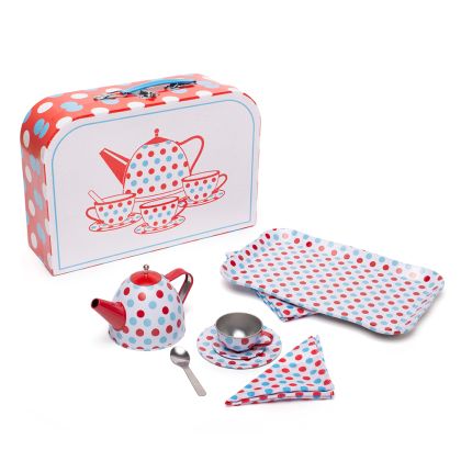 Ще можеш да направиш незабравимо чаено парти, изпипано до най-малкия детайл. Дизайнът на точки ще е изключително интересен на децата, а металната му изработка ще предотврати счупването на съдовете. След игра, комплектът може да се съхранява в куфарчето към него. Той се състои от 4 метални чашки, 4 малки чинийки, 4 големи чинийки, 4 лъжички в калъфче, 4 салфетки, покривка, чайник и метална табла., с които ще можеш да сервираш чай и сладкиши на куклите и приятелите си. Комплектът стимулира въображението и ролевата играта по забавен и занимателен начин.