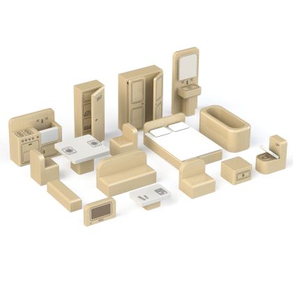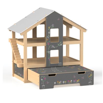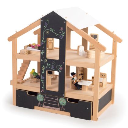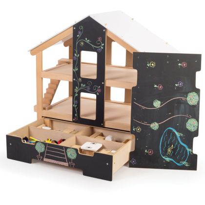 В натурални цветове и красиво конструирана, обзаведената отворена куклена къща обещава дълги и забавни игри. Тя е изключително здрава, изработена от букова дървесина, а децата могат да я украсят както пожелаят, защото от всичките ѝ страни има черни дъски за рисуване с тебешири. Могат да се нарисуват растения, прозорци, врати или други дизайни. В къщата ще намерите и четири комплекта мебели (16 на брой) за баня, хол, спалня, кухня, както и подвижно стълбище. Към къщата има и голямо чекмедже за съхранение, което може да увеличи и пространството за игра и върху което децата могат да нарисуват градинка с растения. Тъй като е отворена, къщата позволява и групова игра, а след като играта приключи, мебелите могат да се приберат в чекмеджето. Игрите с къщата насърчават ролевата игра, въображението и креативността. Изисква се сглобяване от възрастен. Изработката е от висококачествени и безопасни материали.