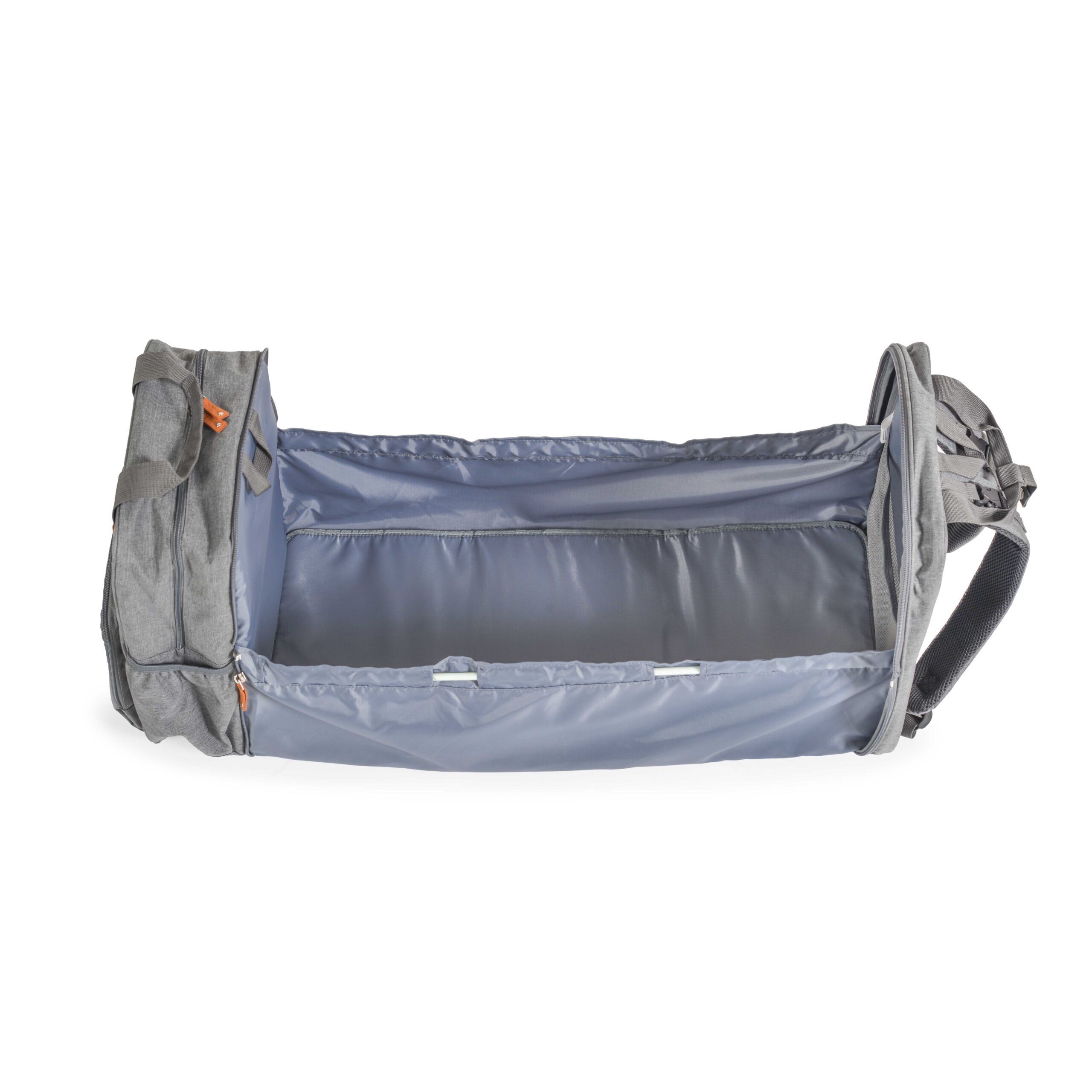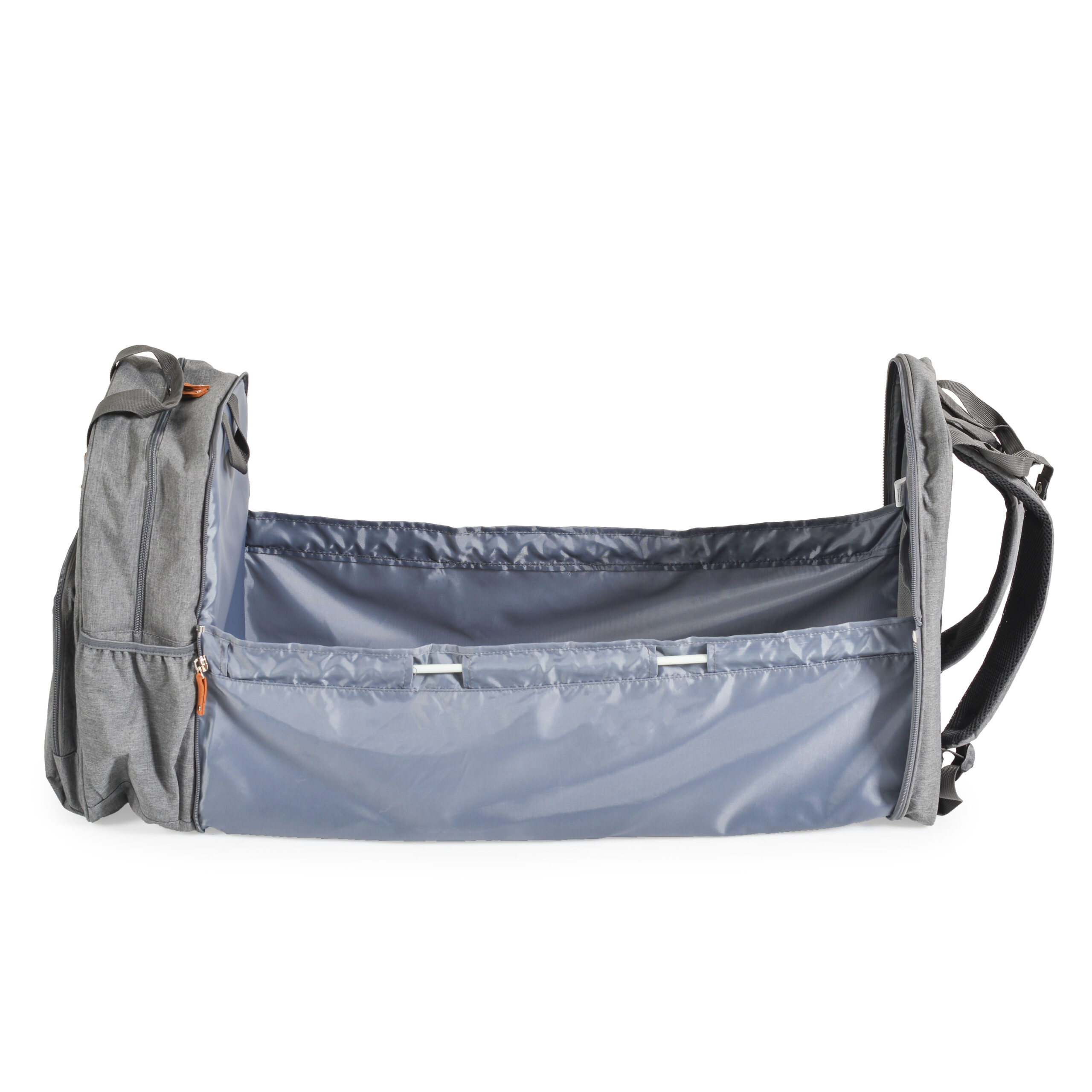 Този уникален продукт е изключително полезен и необходим за всеки родител. Той е мултифункционален и предлага 2 продукта в 1 – чанта и преносимо легло за бебе. Разполага с преден джоб с цип и странични джобове с ластично прибиране, където може да съхранявате всичко необходимо. Към продукта има включени аксесоари – две къси дръжки и две дълги дръжки, клипсове за лесно прикрепяне към дръжката на количката, широк отвор на основния джоб за по-лесен достъп.