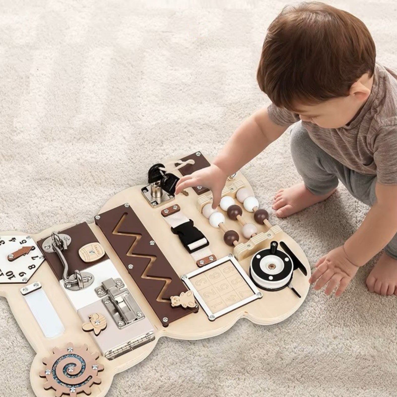 Със своята форма на сладко мече и стилна комбинация от натурално дърво и кафяво, Дървеният Бизи Борд Мече е не само полезен, но и естетично допълнение към детската стая. Леката и компактна конструкция го прави удобен за игра у дома, в детската градина или по време на пътуване. Изработен е от висококачествени и безопасни материали Дървен Бизи Борд Мече – шперплат, MDF и метал – с гладки ръбове и нетоксично покритие, гарантиращи безопасност за малките ръчички.