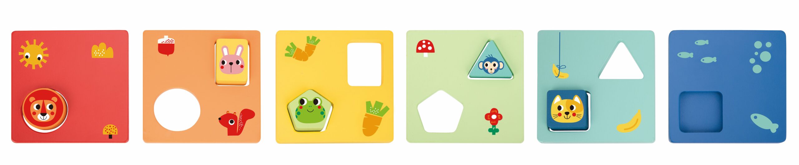Монтесори логически сортер. Идеален да развие способностите на вашето дете. Комплектът включва 11 елемента –  6 дъски и 5 фигурки.
