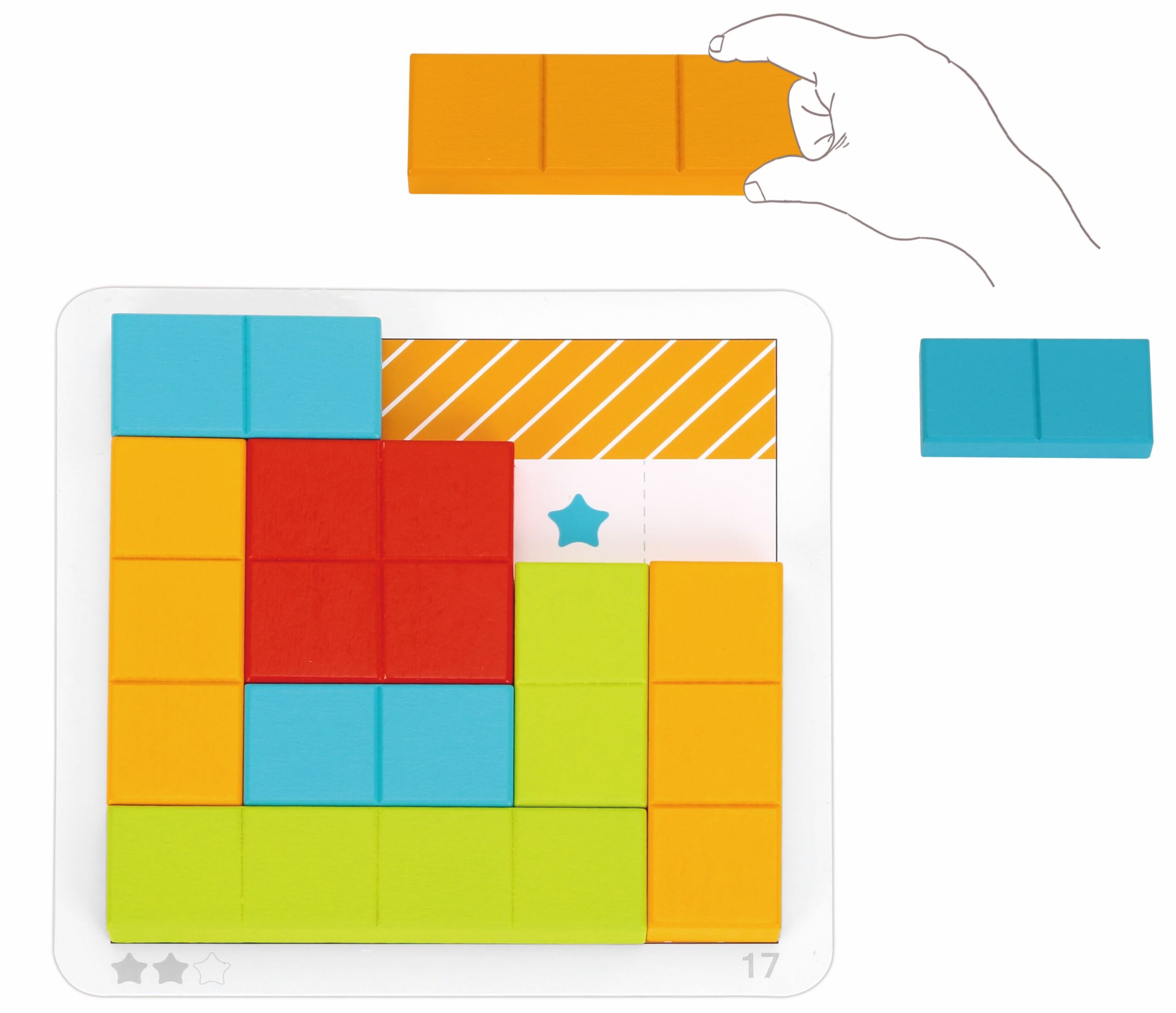 С нея децата ще развият своята логика и мислене. В комплектът има карти с нивата, които детето трябва да мине и дървени блокчета с различен цвят и брой квадратчета.