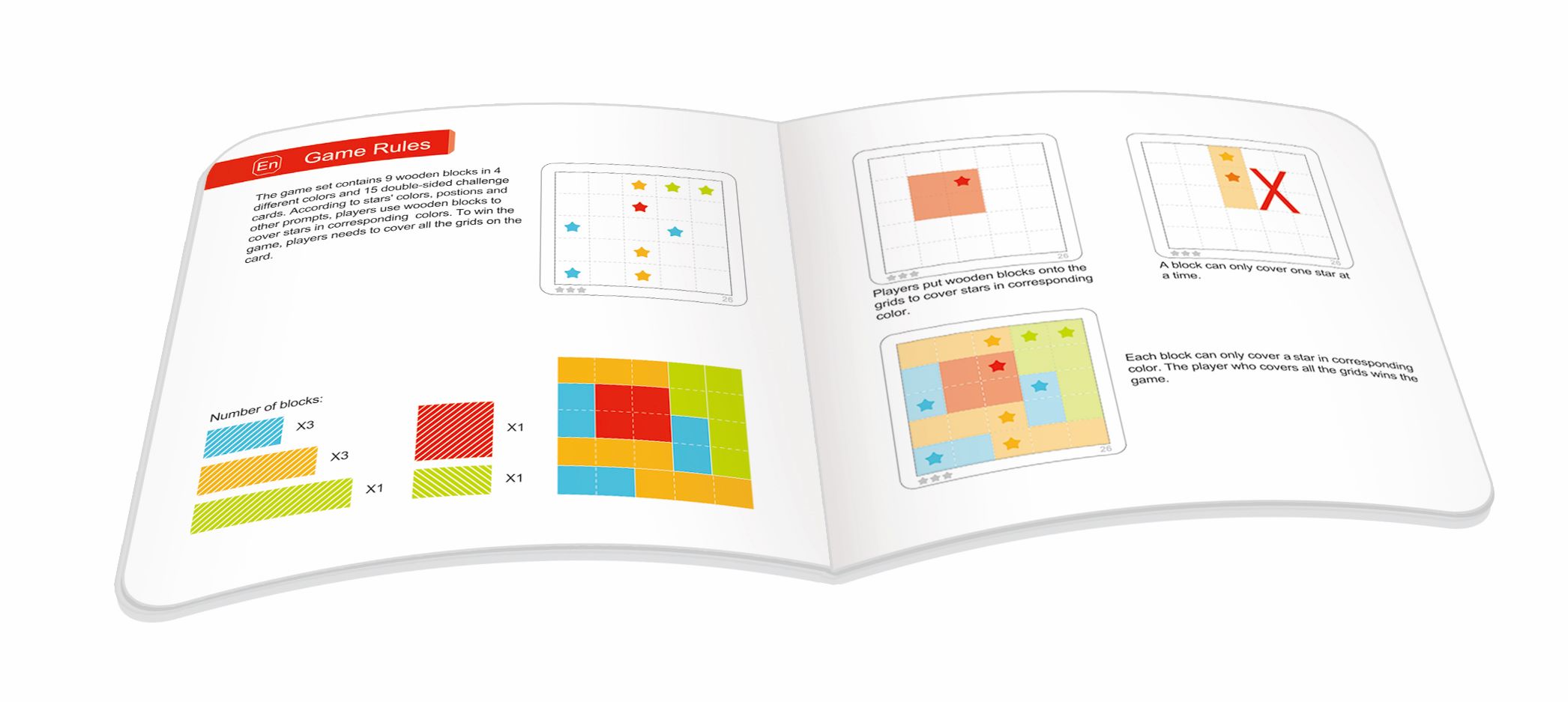 Съдържа части, които трябва да наредите на полето така, че всяка част, да е стъпила върху звездичката със съответния цвят.