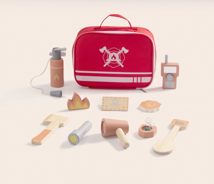 Вдъхновете смели спасителни мисии с дървения комплект „Малкият пожарникар“ от Tooky Toy. В практичното куфарче ще откриете пожарогасител, мегафон, брадва и лопатка – всичко необходимо за вълнуващи ролеви игри. С този комплект децата не само ще се забавляват, но и ще развиват въображение, социални умения и креативност, докато влизат в ролята на истински герои.
