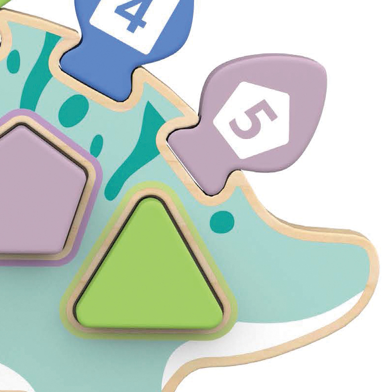 Забавен и цветен, дървен сортер пъзел Dinosaur във формата на динозавър съчетава игра и учене. Детето може да подрежда различни геометрични фигури и да брои елементите на гърба на динозавърчето. Подходящ е за деца на възраст 18+ месеца.