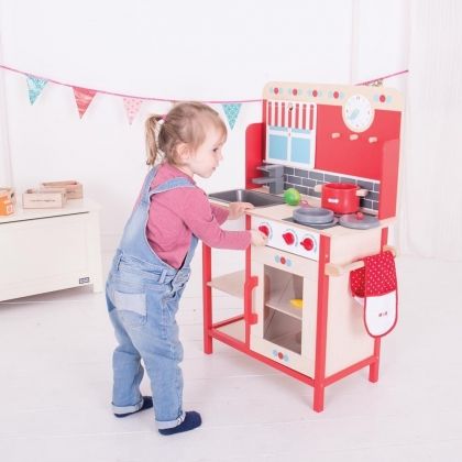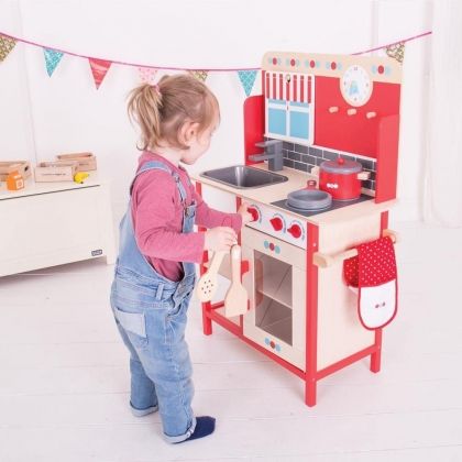 Червената дървена кухня на Bigjigs съдържа всичко необходимо, за да може малкият готвач да приготвя истински гурме ястия – тенджера, тиган, дървени лъжица, решетеста лъжица и шпатула. Ключетата на печката се въртят и издават кликащ звук, а фурната се отваря, но не забравяйте да използвате готварските ръкохватки, когато вадите храната от фурната. Часовникът над кухнята е с мърдащи се стрелкички, за да наблюдавате да не изгори ястието, а прозорецът се маха, като под него има черна дъска за писане с тебешир, на която можете да пишете дневното меню или пък рецепти. Заниманията с кухнята са полезни за развитието на ролевата игра и въображението. Изработката е от дърво и е боядисана с бои на водна основа. Изисква се монтаж от възрастен.