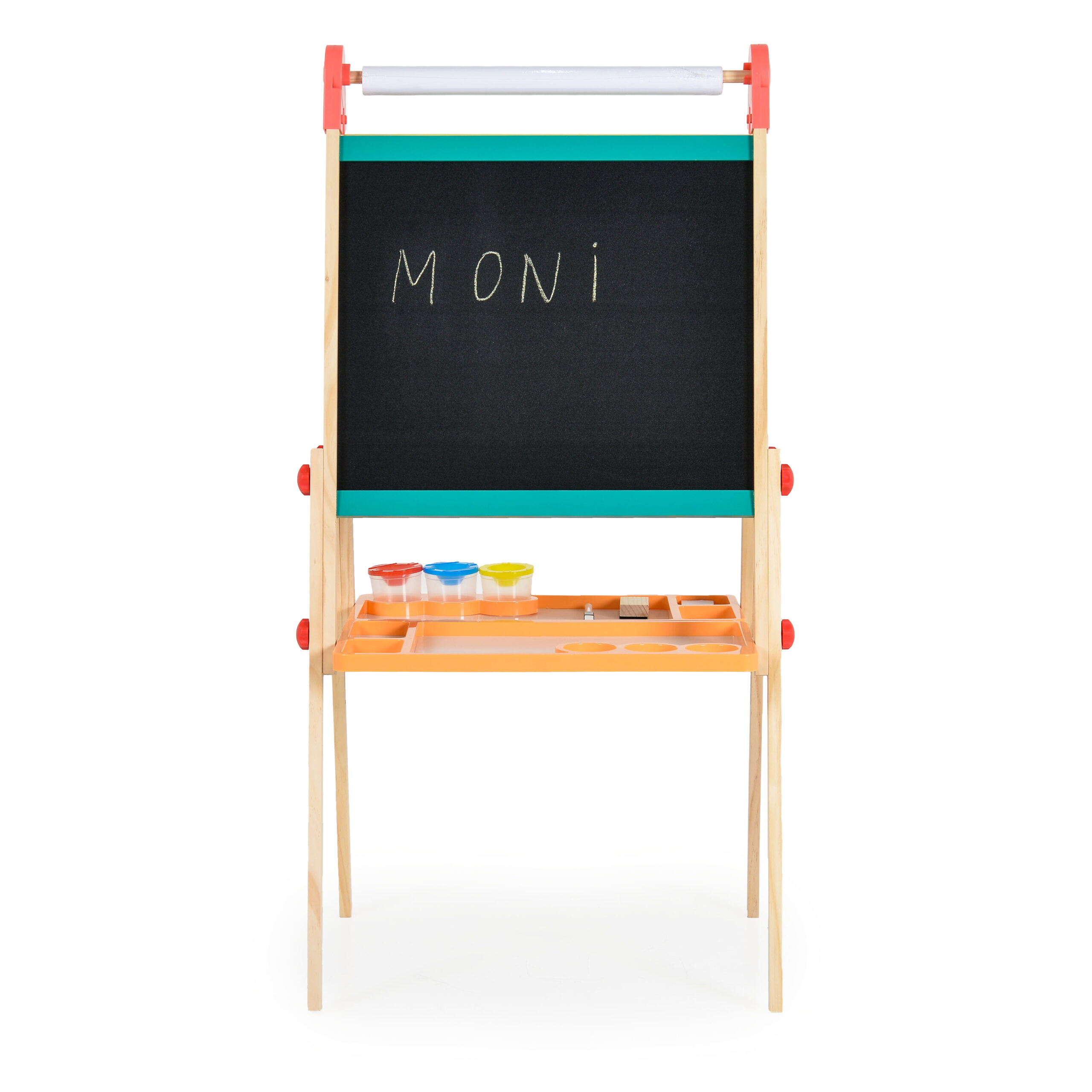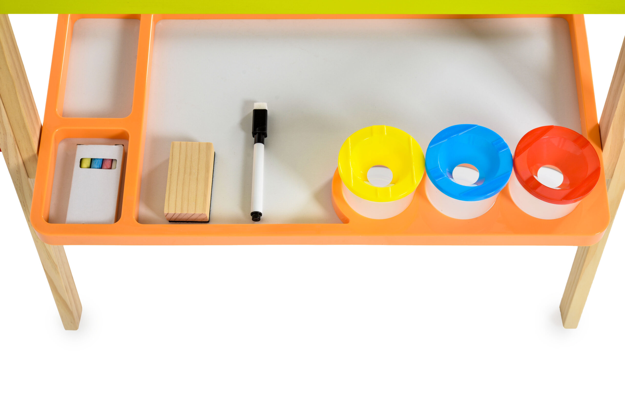Освен това, комплектът включва и 4 тебешира, 3 контейнера за боя, 1 маркер, 1 гъба за почистване и ролка бяла хартия за допълнително творчество и упражнения по писане.