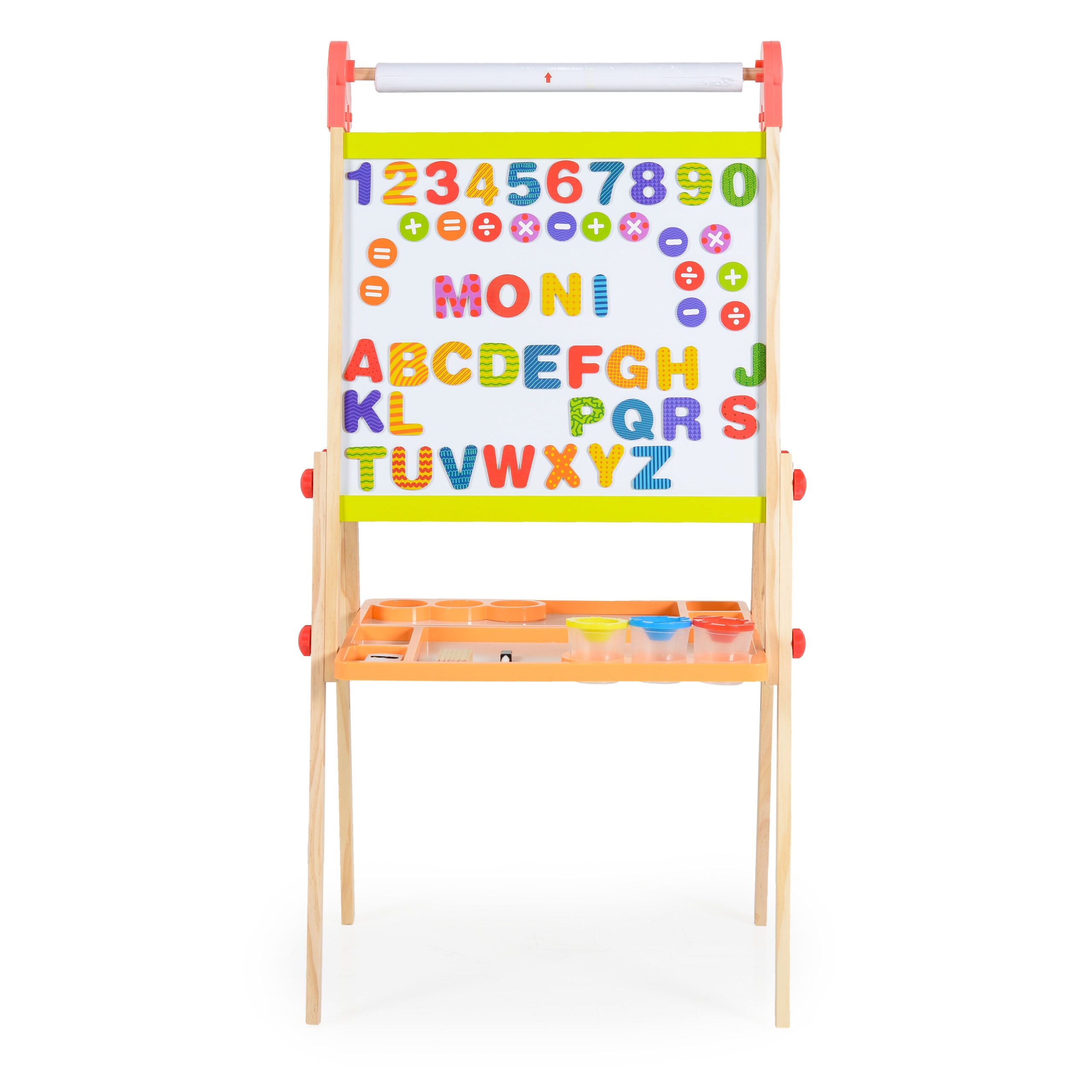 Тази дъска насърчава ученето чрез игра с включения комплект от 51 магнита – букви, цифри и знаци, което прави изучаването на азбуката и математиката забавно и интерактивно.