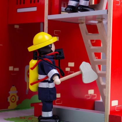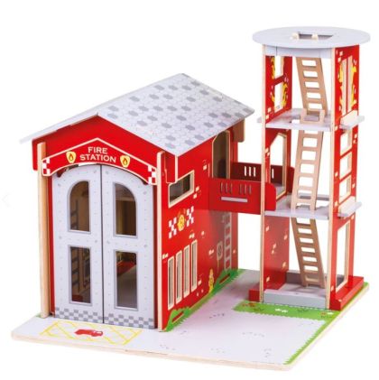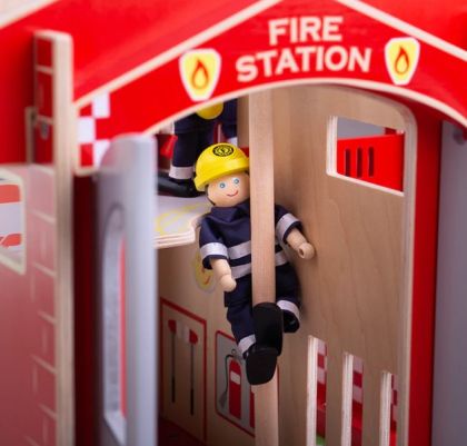 Насърчете въображението на малките пожарникари у дома и ги зарадвайте с невероятната играчка на Bigjigs. Тази огнена градска дървена сглобяема играчка представлява противопожарна станция, в която пожарникарите във всеки един момент са нащрек и готови да се втурнат да помагат! Тази възхитително детайлна дървена противопожарна станция разполага със стълб за пожарникар, тренировъчна кула с подвижни стълби, мецанин за жилищните помещения на пожарникарите, работещи двойни врати и подвижни покривни панели за лесен достъп.