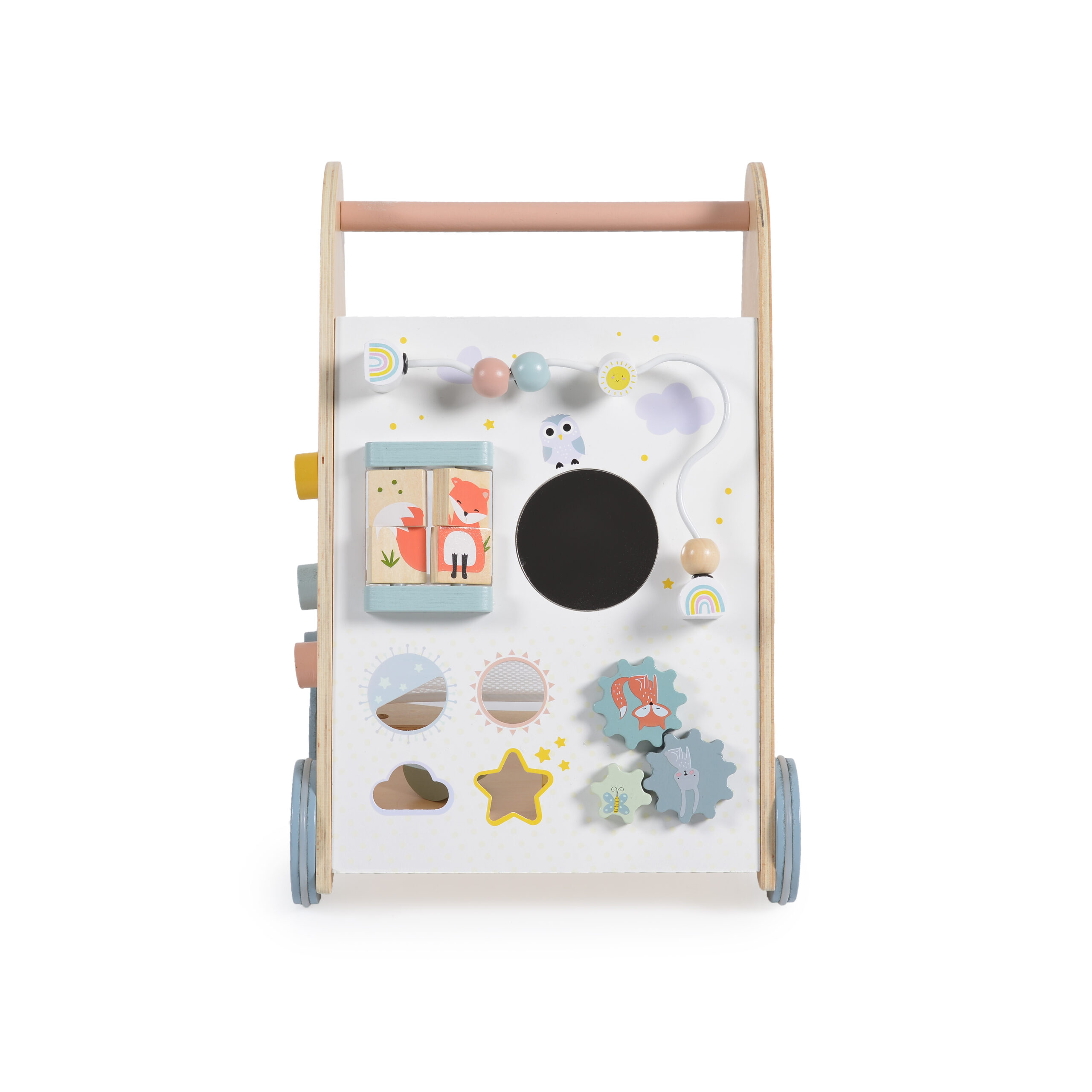 Превърнете първите крачки на вашето дете в истинско приключение! Тази очарователна дървена играчка съчетава стабилна опора за прохождане с много забавни и развиващи игри. Предната ѝ страна е активен център с въртящи се елементи, фигури и огледалце, които стимулират сетивата и любопитството. Отстрани има сортер с различни форми, които развиват логическото мислене и координацията.