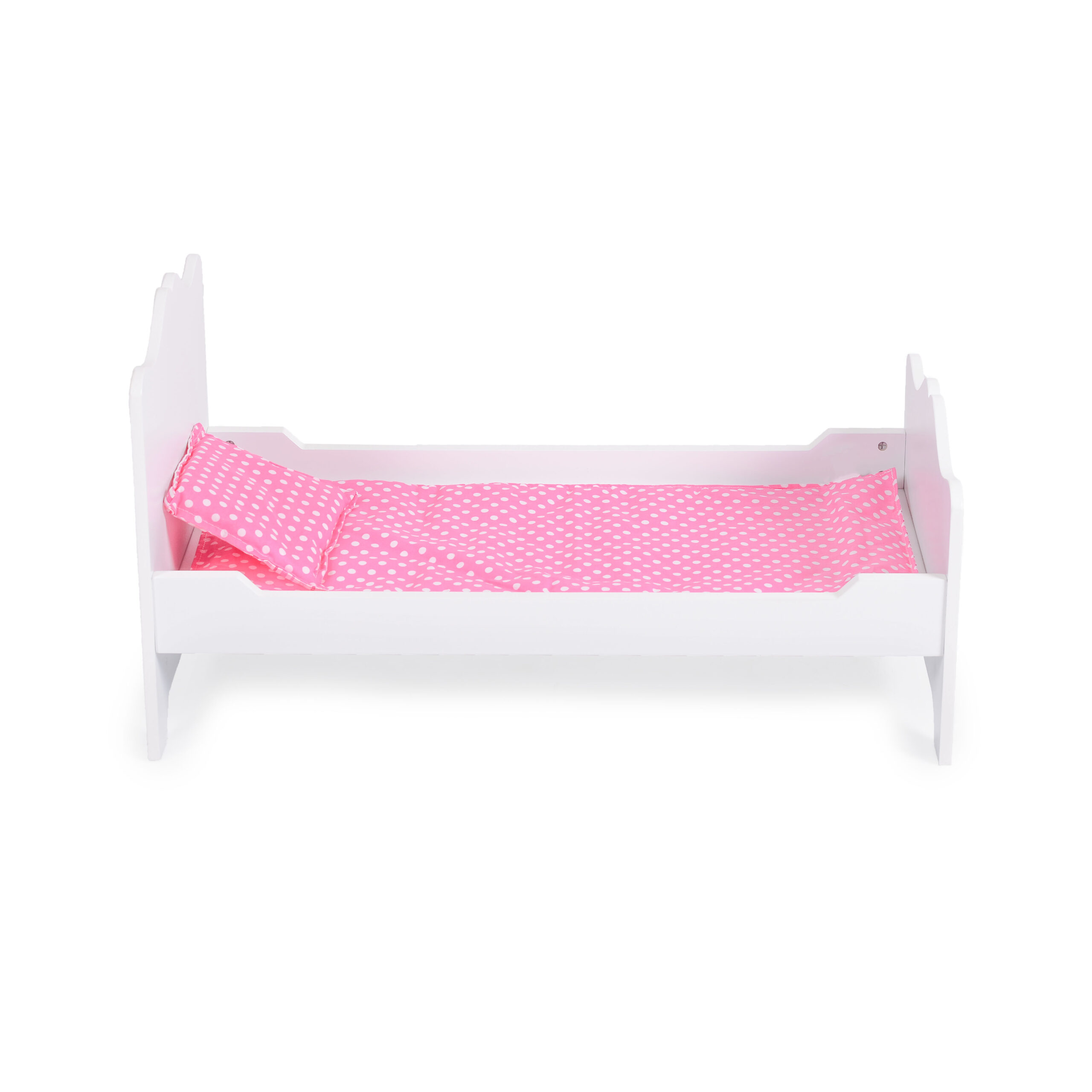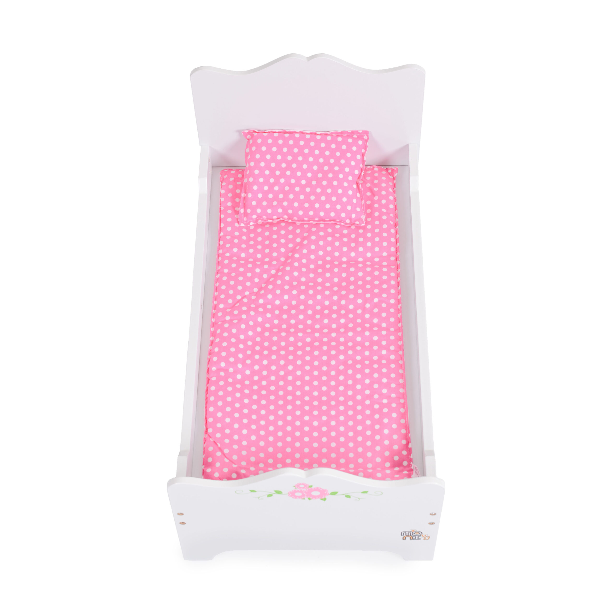 Дървено легло за кукли в бял цвят с деликатни флорални детайли. Включен е комплект завивка и възглавничка. Със своя изчистен дизайн, то прави игрите още по-реалистични и забавни, докато децата играят с любимите си кукли.