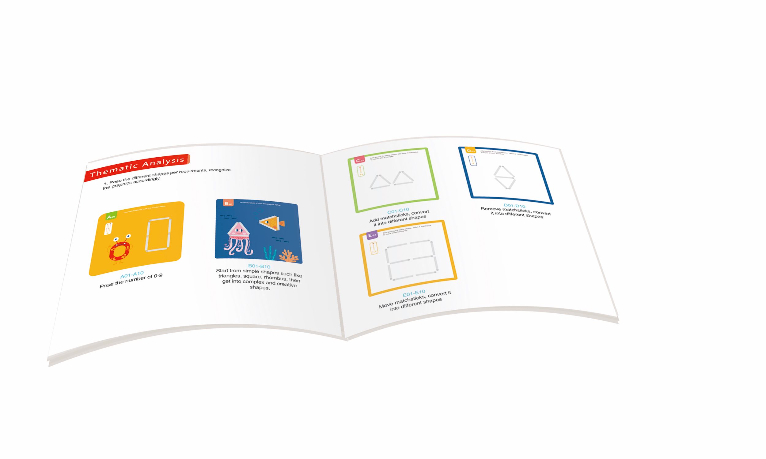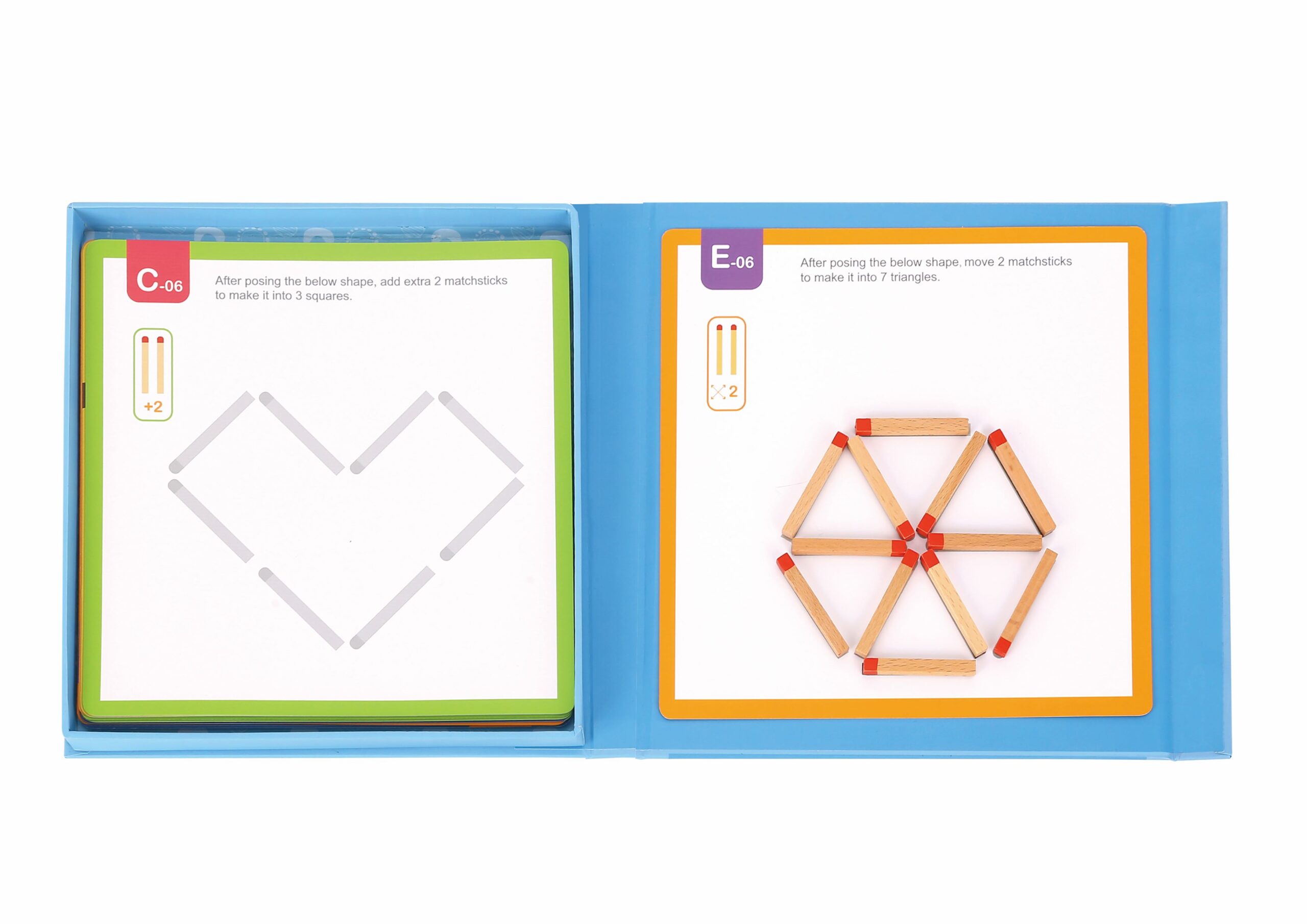 Играта разполага с дървени магнитни клечки за кибрит, които децата могат да поставят върху картите, за да пресъздадат форми и картини.
