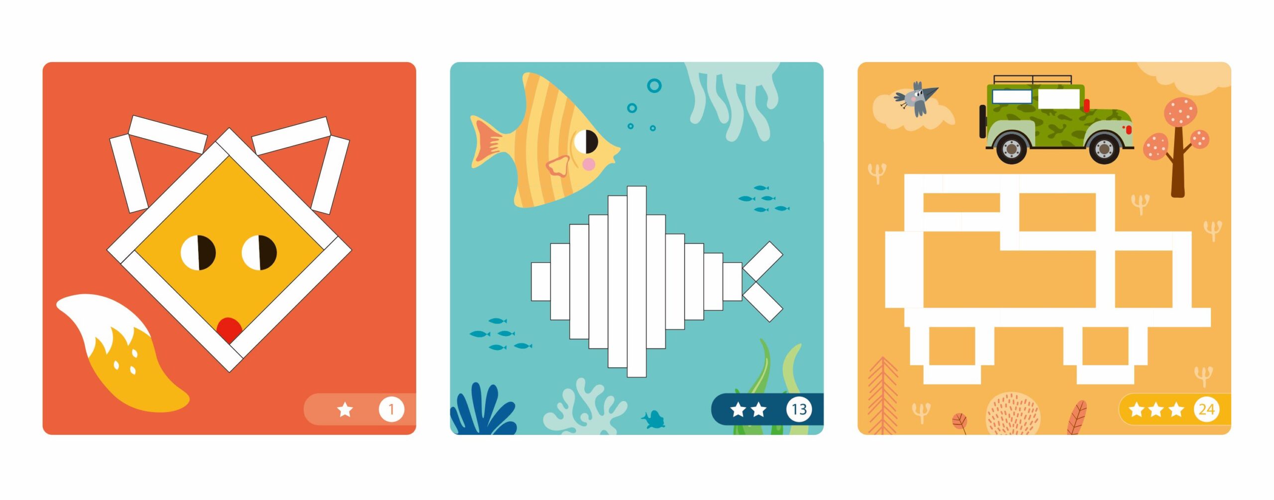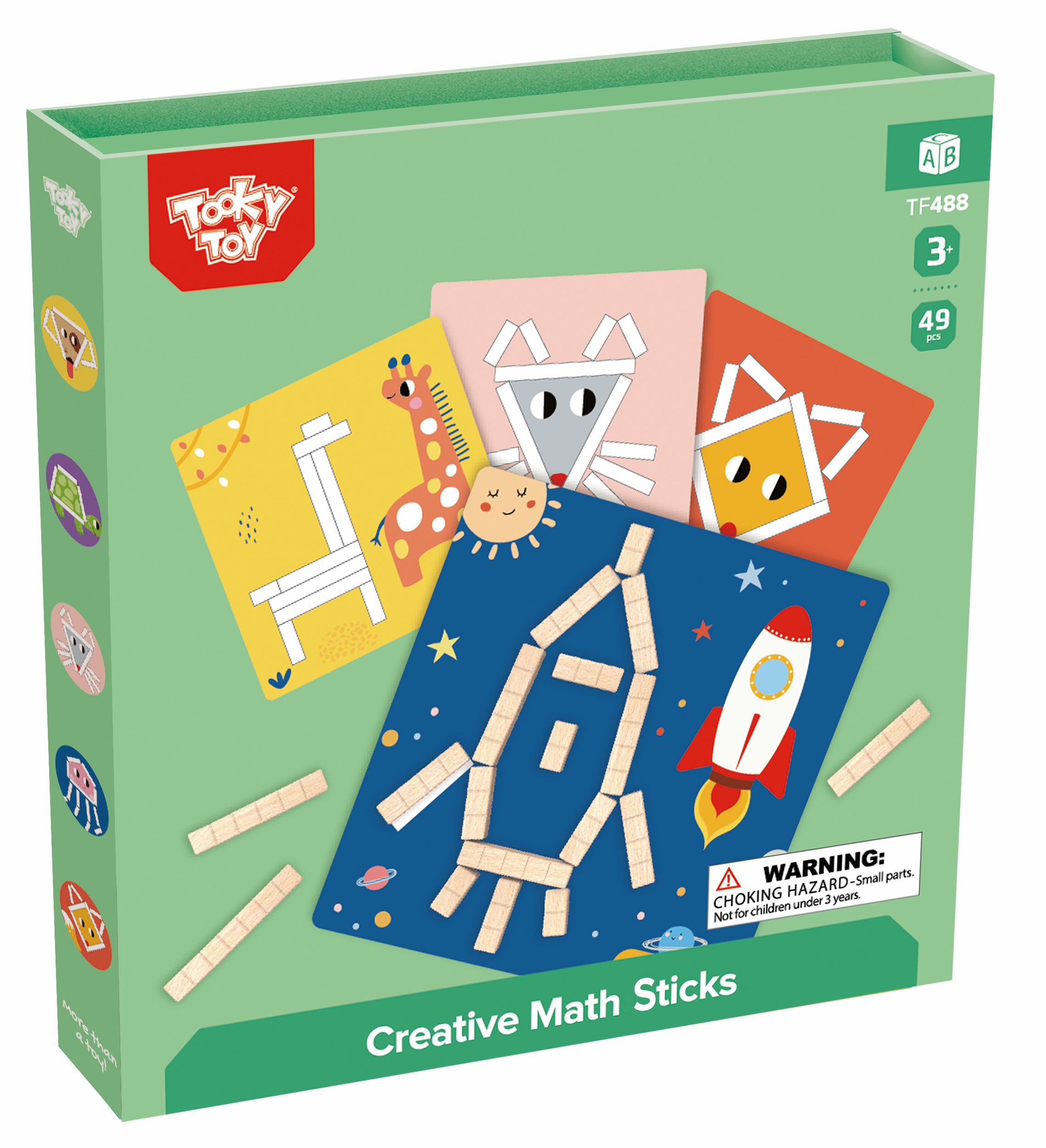 Комплекта съдържа 24 карти с изображения, 36 дървени магнитни пръчици с различни дължини и книжка с идеи за подреждане.
