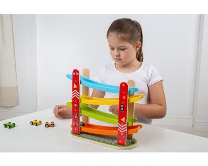 Време e за състезание! Малките състезатели с интерес ще наблюдават как дървените колички се състезават по цветните рампи. А дали ще могат да ги хванат в движение, преди да са стигнали финала? Ще трябва да са много бързи. Чудесна игра, която ще насърчи въображението и фината моторика. Изработката е от висококачествени и безвредни материали.