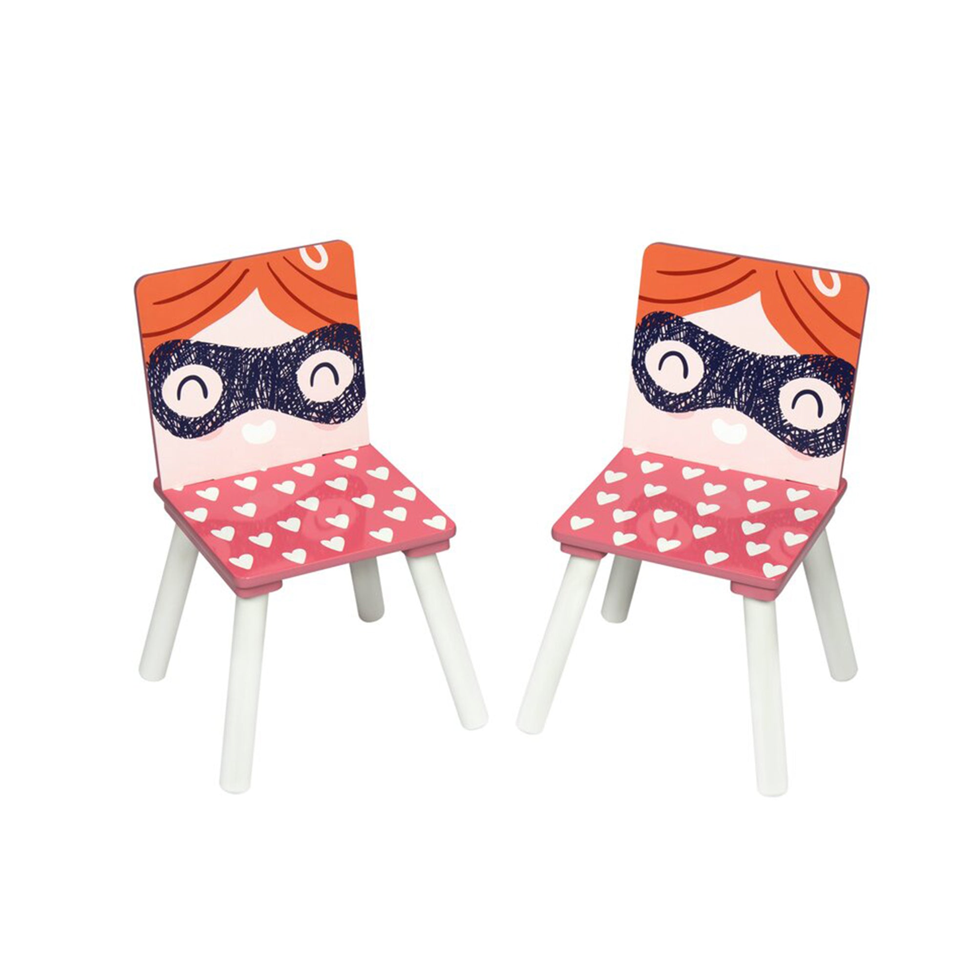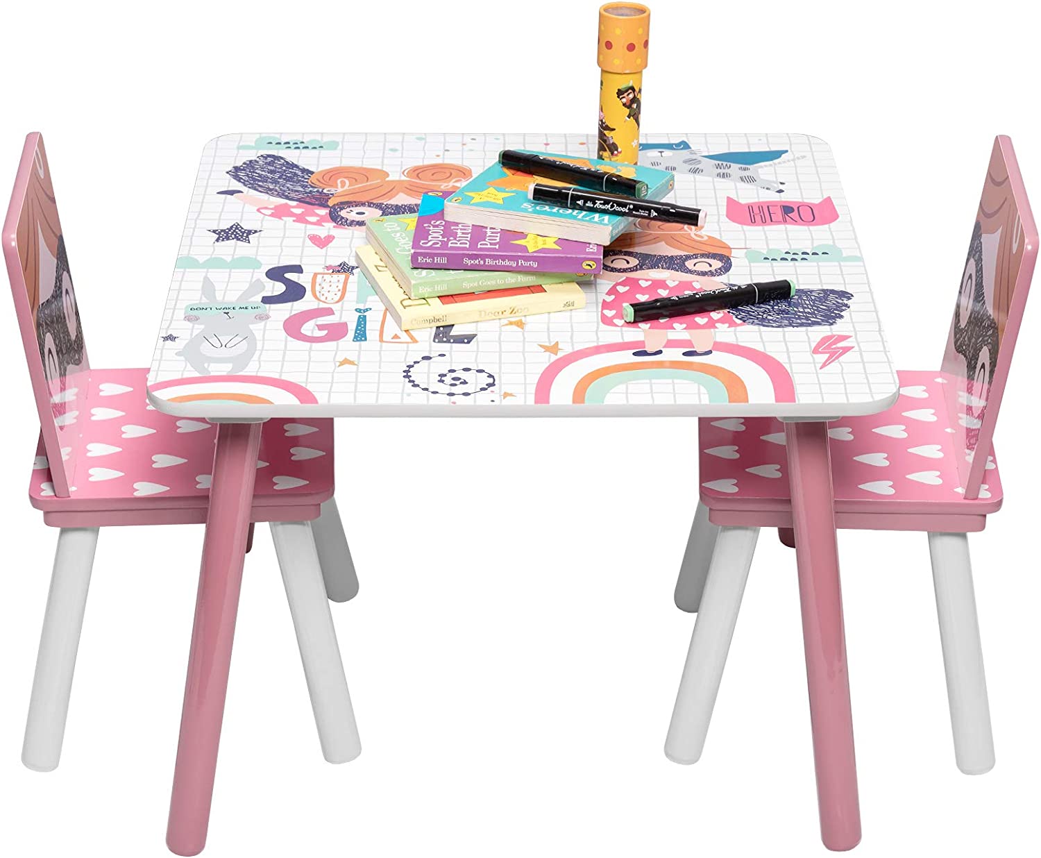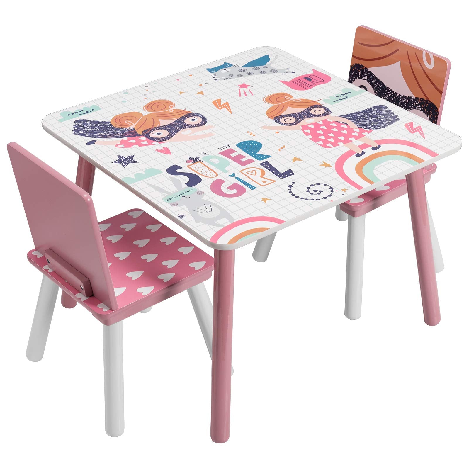 Детска Дървена Маса с 2 Столчета, Комплект за Учене, Игра, Рисуване, Хранене, Бяло, Розово – SUPER GIRL