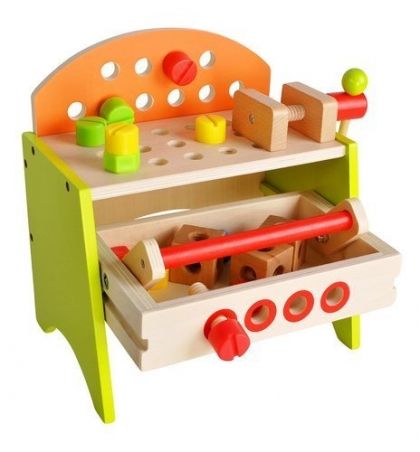Страхотна, развиваща играчка, която всеки малък майстор ще хареса. Дървената работилница за деца ще им позволи да имитират възрастните, а знаете, че ученето чрез имитация е най-добрия начин за развиване на различните умения. Използвайки винтове, гайки, гаечни ключове и отвертки ще могат да се изградят багер, кран, вятърна мелница, самолет, робот и много други фигури. Мъниците ще се научат и колко е важно да се внимава с инструментите, докато стимулират фините си моротни умения. Работната маса разполага с чекмедже, в което да се слагат инструментите, а на гърба има достатъчно дупки, че да се направи рафт за инструменти. Заниманията с комплекта насърчават сръчността, въображението и логическото мислене. С толкова много аксесоари няма как да се скучае!