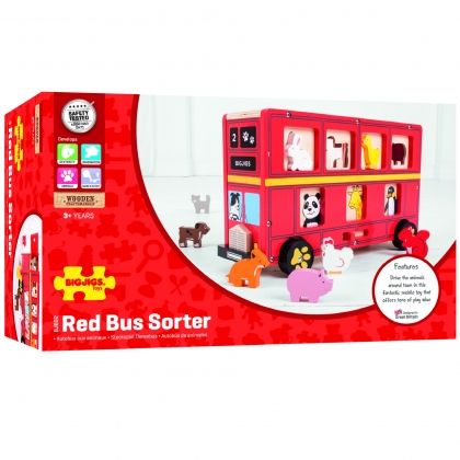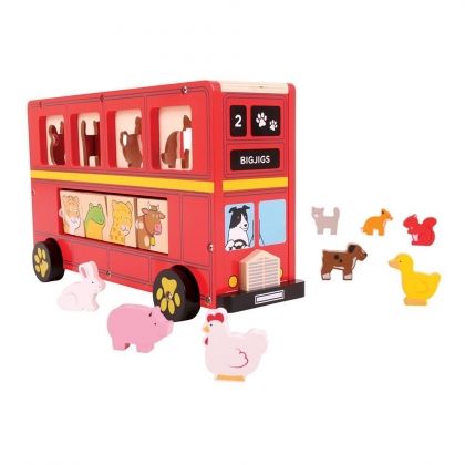 Карайте цветната колекция от дървени животни из града с този красиво изработен автобус. Животните се поставят на правилните места отстрани. Пътниците от горната част могат да минат в долната чрез плъзгача. В края на пътуването си животинките могат да слязат през задната част на автобуса. Заниманията със сортера ще насърчат наблюдателността, сръчността и комуникационните умения.