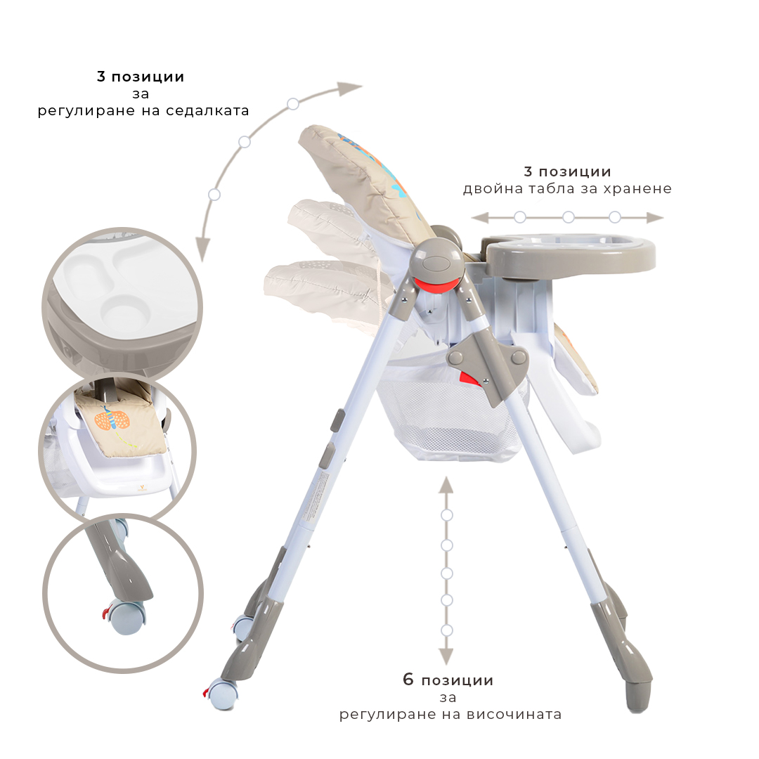 – Опция за прибиране на таблата върху задните крака на столчето;