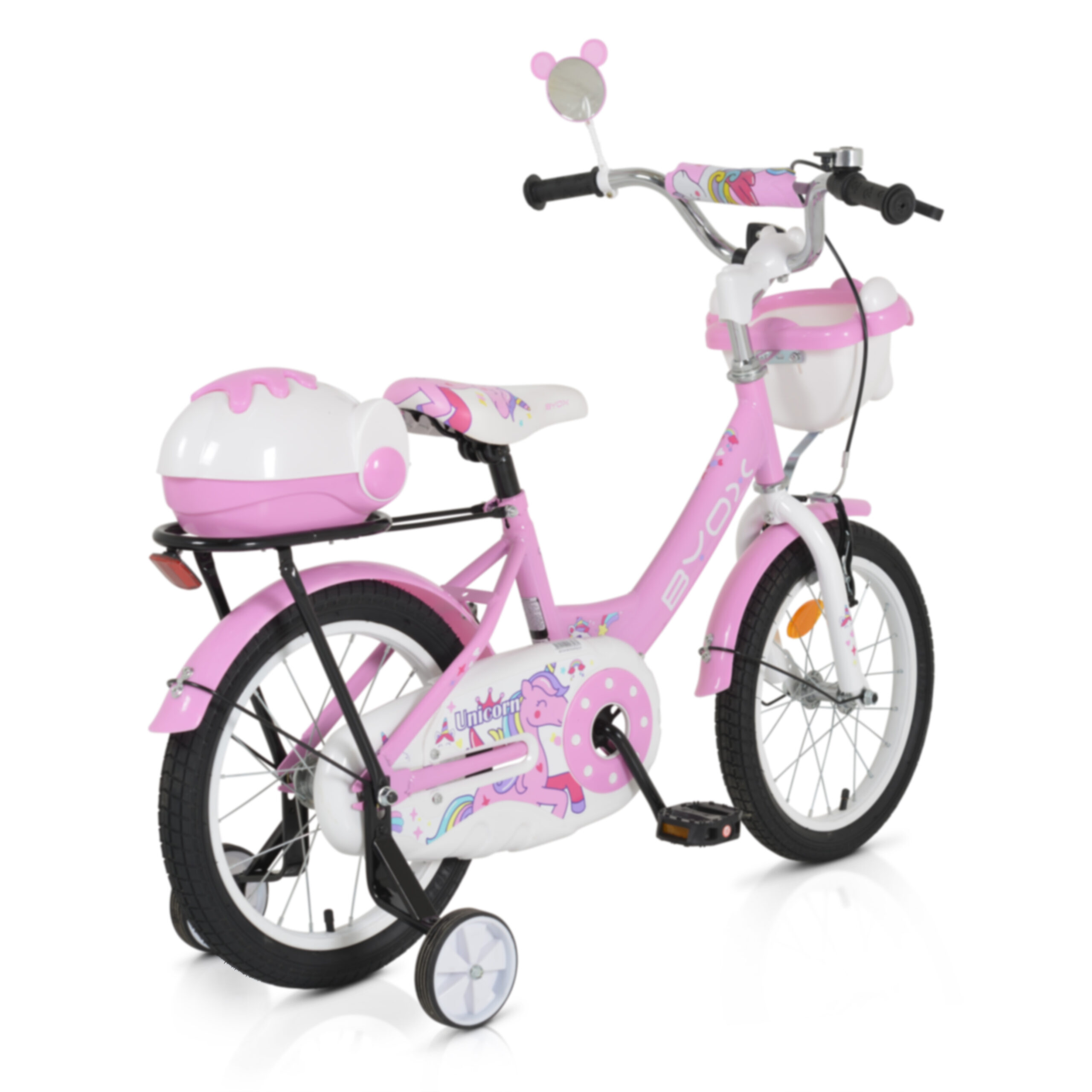 Детският велосипед е оборудван с помощни колела, звънец, огледало, пластмасови калници, преден и заден кош.