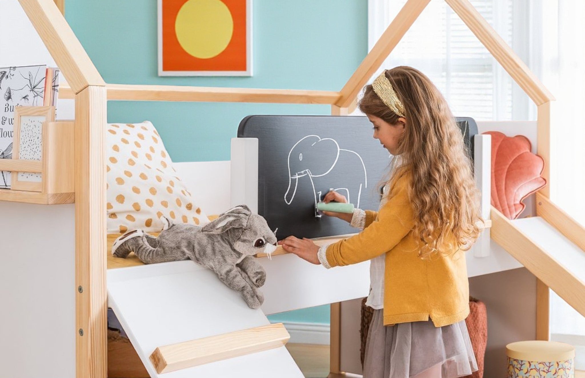 •    Пързалка: Забавен начин за децата да слязат от втория етаж. Детското легло Къщичка включва пързалка за добавена радост и вълнуващи приключения директно в детската стая.