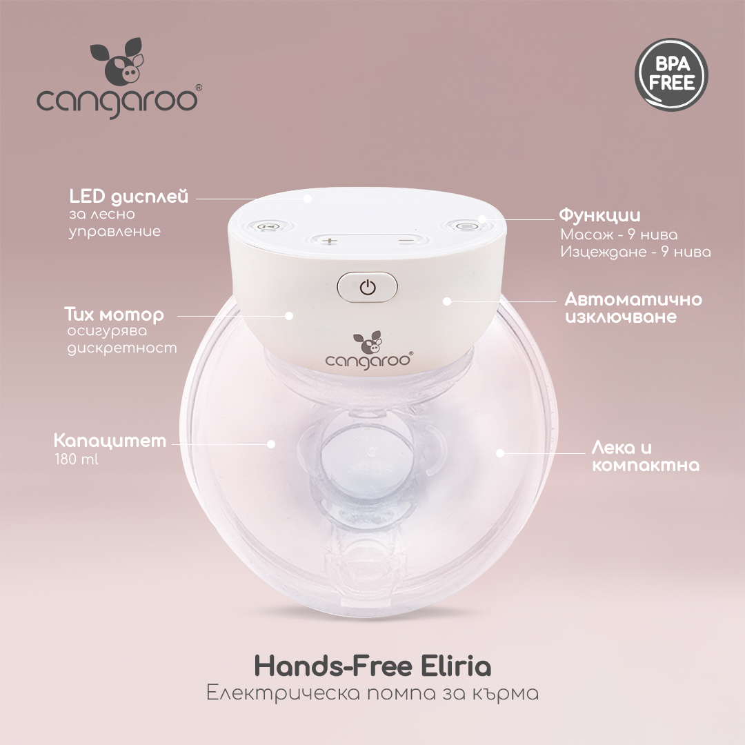 Електрическа помпа за кърма Eliria Hands-Free перфектната помпа за кърма, която съчетава удобство, ефективност и дискретност, за да улесни живота на всяка майка. Лека и компактна, тя е идеална за пренасяне, без да заема място в чантата ви.