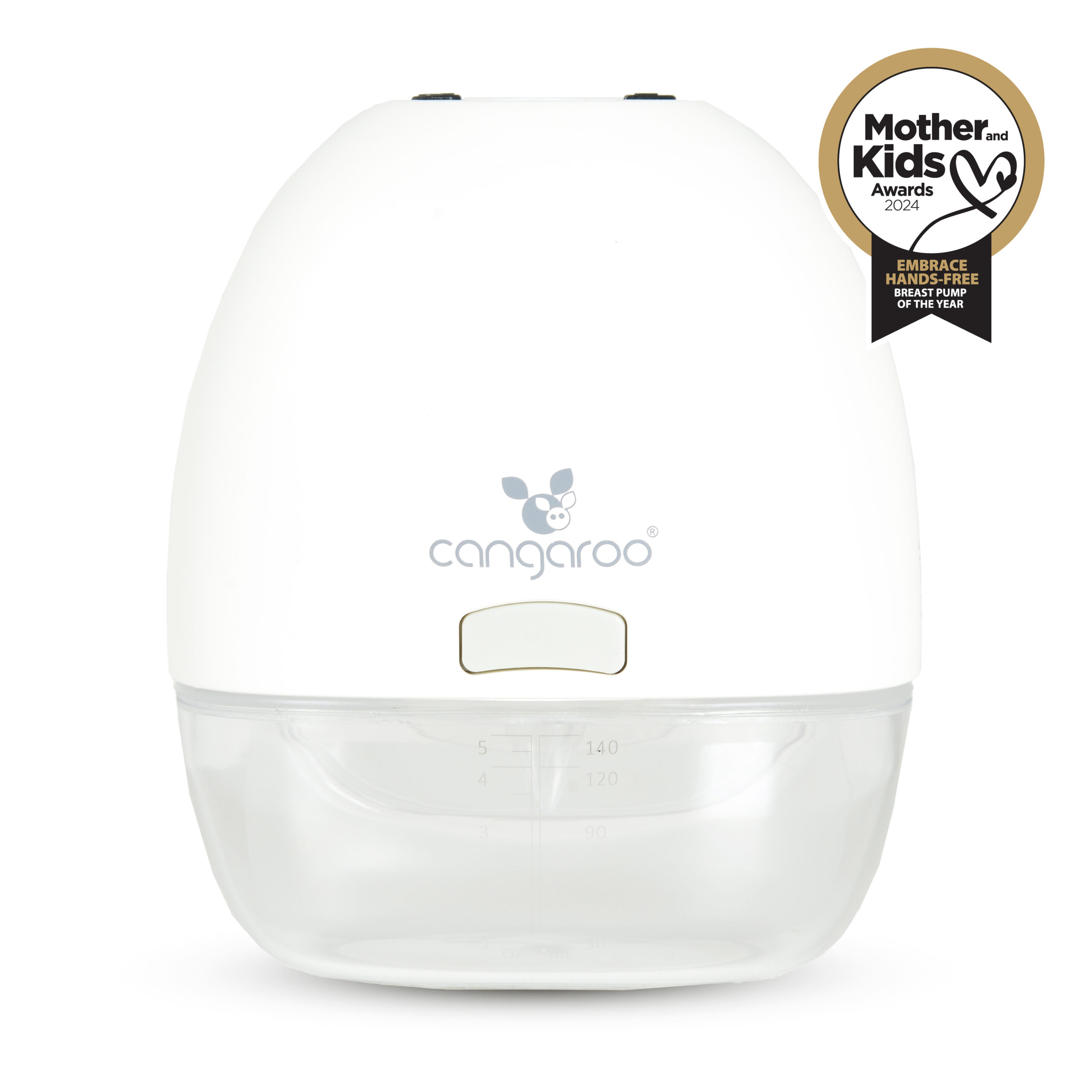 Embrace Hands-free е най-малката и първата, носеща се върху гърдата, електрическа помпа за кърма на Cangaroo. Иновативният й дизайн позволява на всички майки да изпитат красотата на кърменето, без да се опасяват от обичайните при ползването на този вид уреди дискомфорт и болка. Нещо повече, имате свободата да използвате Embrace Hands-Free по всяко време и навсякъде. Дори съчетанието на майчинството и работните ангажименти е по-лесно с Embrace Hands-Free. ЗАЩОТО тя не се нуждае от допълнителни усилия – просто поставяте помпата директно върху гърдата и готово…..Ултра тънката чашка се побира удобно в сутиена, като осигурява лесен процес на събиране на млякото в контейнер, който е прикрепен към вътрешния механизъм на помпата.