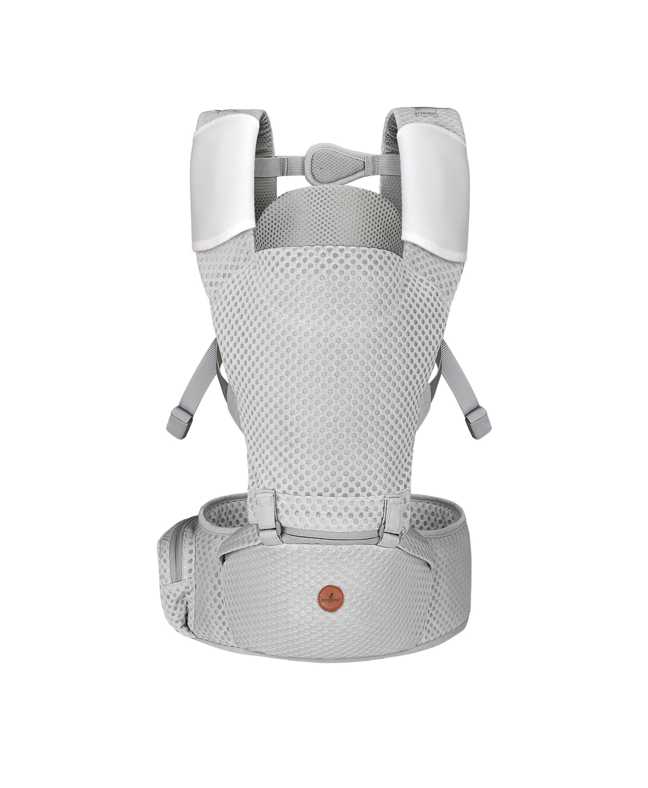 Допълнително, кенгуруто е снабдено с подплатена база, която абсорбира вибрациите по време на движение и повишава комфорта за детето. Базата също така има противоплъзгащо покритие, което гарантира сигурността и стабилността на бебето, като същевременно осигурява на крачетата ергономична M-форма, подходяща за здравословното развитие на бедрените стави. Базата може да се използва и самостоятелно.
