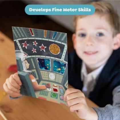 Всяко дете може да се превърне в междугалактически художник, като създава блестящи сцени с ракети, планети, извънземни, космически костюми и звезди. Комплектът съдържа всичко необходимо, за да се създадат уникални произведения на изкуството с холографско фолио, без нужда от лепило, ножици или бъркотия.