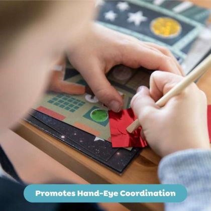 Процесът е лесен и забавен: детето избира предварително подготвена космическа сцена, използва дървения инструмент, за да повдигне лепящите зони от изображението, след което поставя фолиото и го натърква леко, за да залепне. Резултатът е ярко, лъскаво и завършено произведение, което е идеално за подарък или украса.
