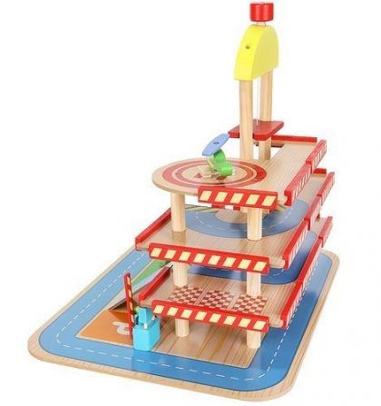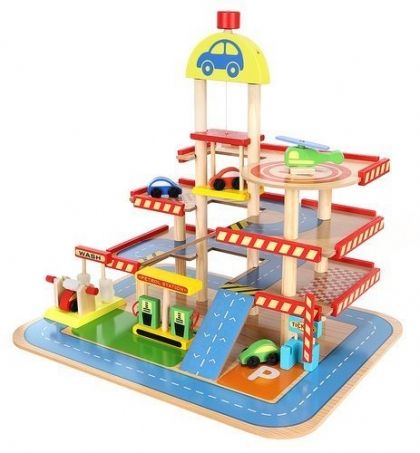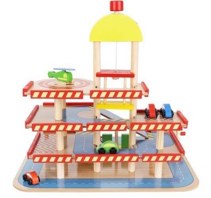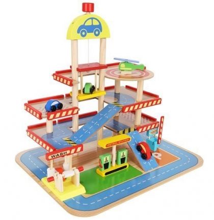 Дървеният паркинг е идеален подарък за всички деца, обичащи колички, като този комплект ще развие рефлексите и сръчността, докато забавлява играчите. Пълният комплект включва 4 коли, хеликоптер, автомивка, билетна каса, бензиностанция, път, 3 нива за паркиране и площадка за кацане на хеликоптер. В допълнение, в комплекта има и части, необходими за сглобяване, като дървени стълбове и винтове. Всеки от сегментите на сградата може да изпълнява различни функции в зависимост от настройките на другите аксесоари. Всички части имат специална форма, която гарантира безопасност, без риск от увреждане на детето. Всички елементи от комплекта са изработени от естествено дърво, имат гладка повърхност и ръбове и са приятни на допир, а боите са безвредни за децата. Играта може да се почиства с влажна кърпа.