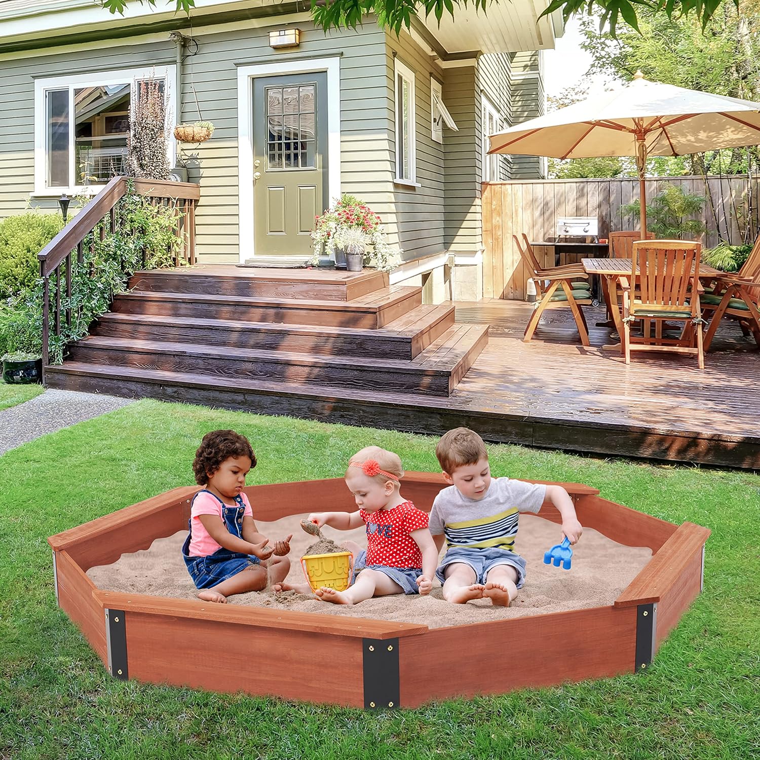 Дайте на децата си просторно място за игра на открито с големия дървен детски пясъчник GINGER HOME в уникална осмоъгълна форма, снабден с водоустойчиво покривало и здрава конструкция за дълготрайна употреба.