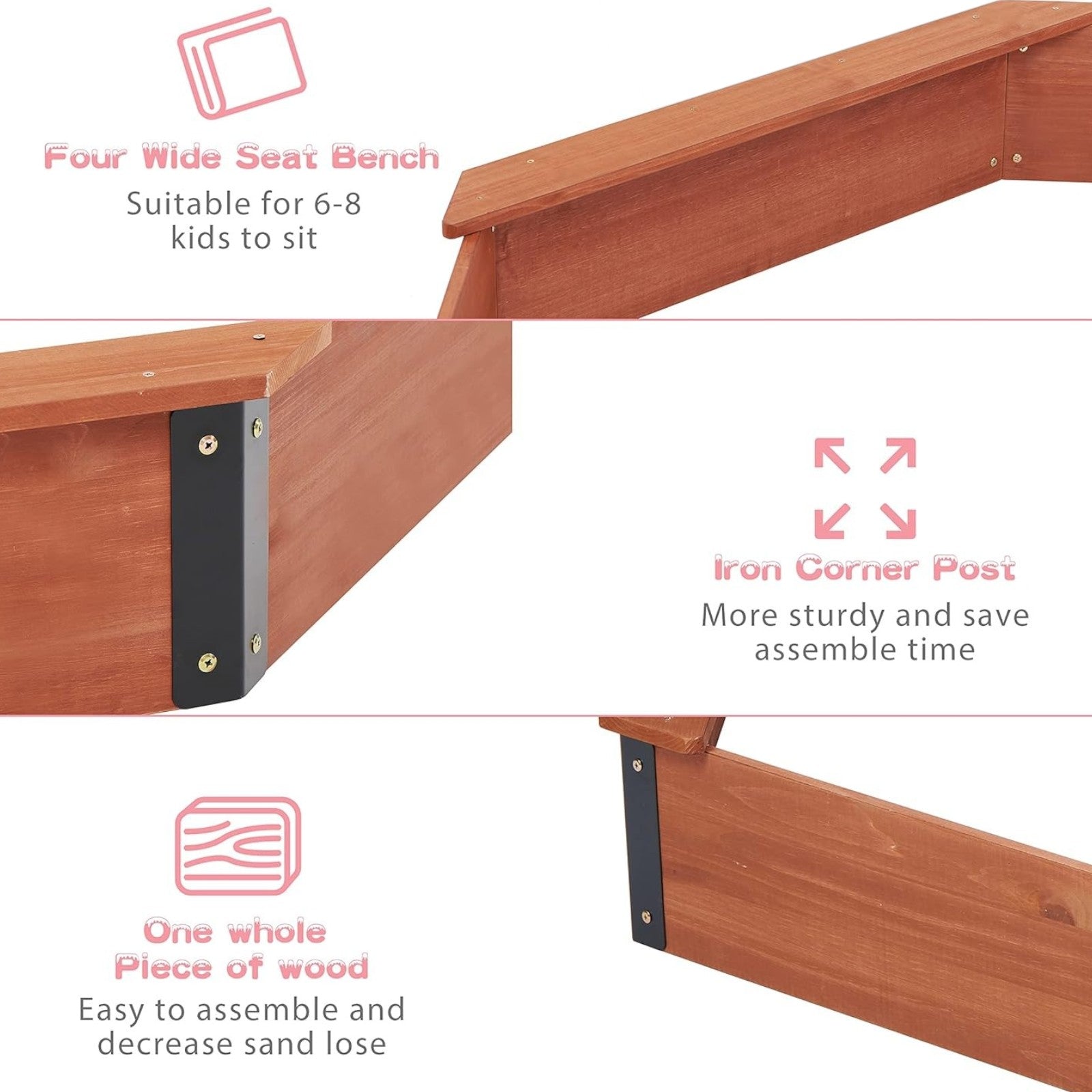 Изработен от борова дървесина с естествено покритие, пясъчникът е проектиран с внимание към безопасността и устойчивостта на атмосферни условия.
