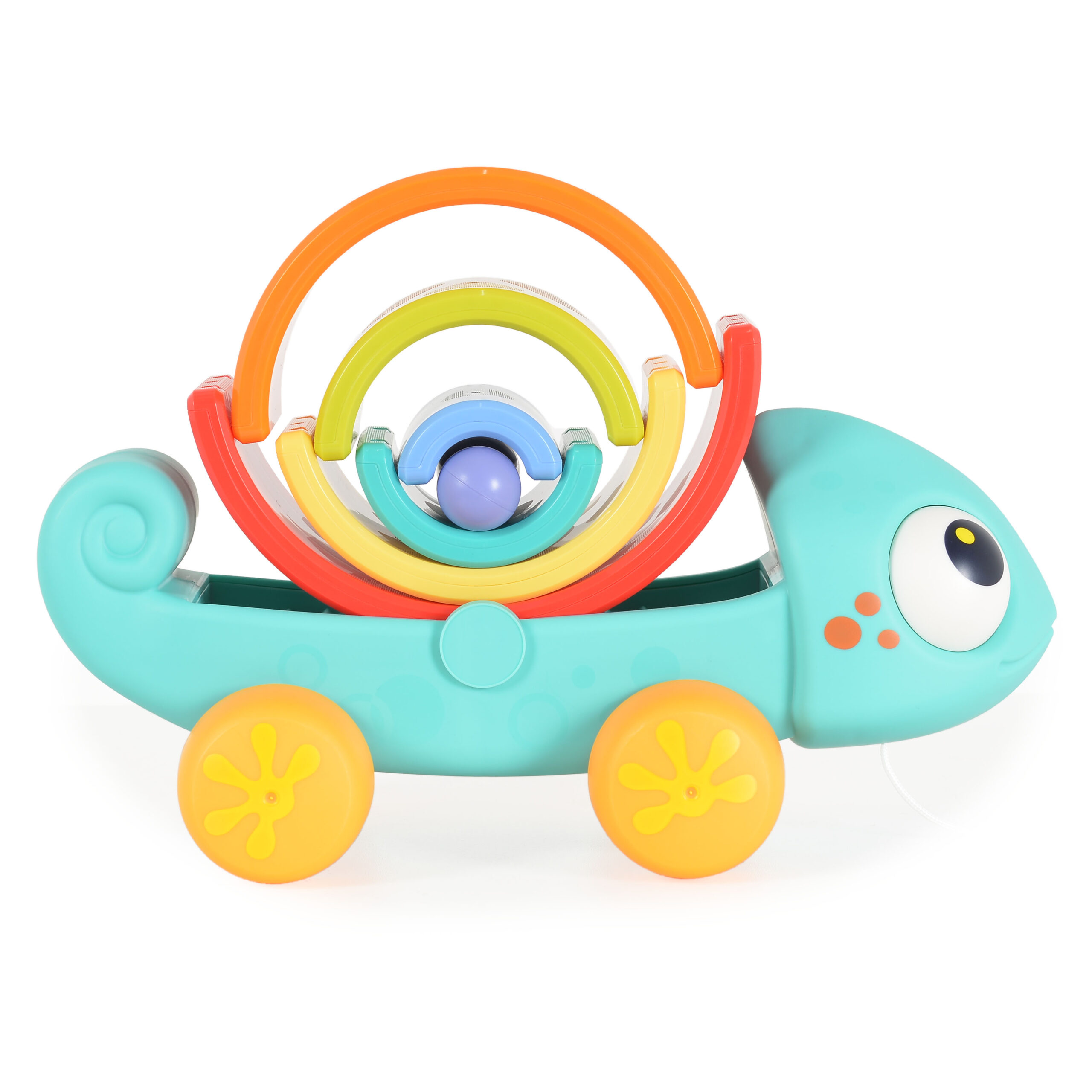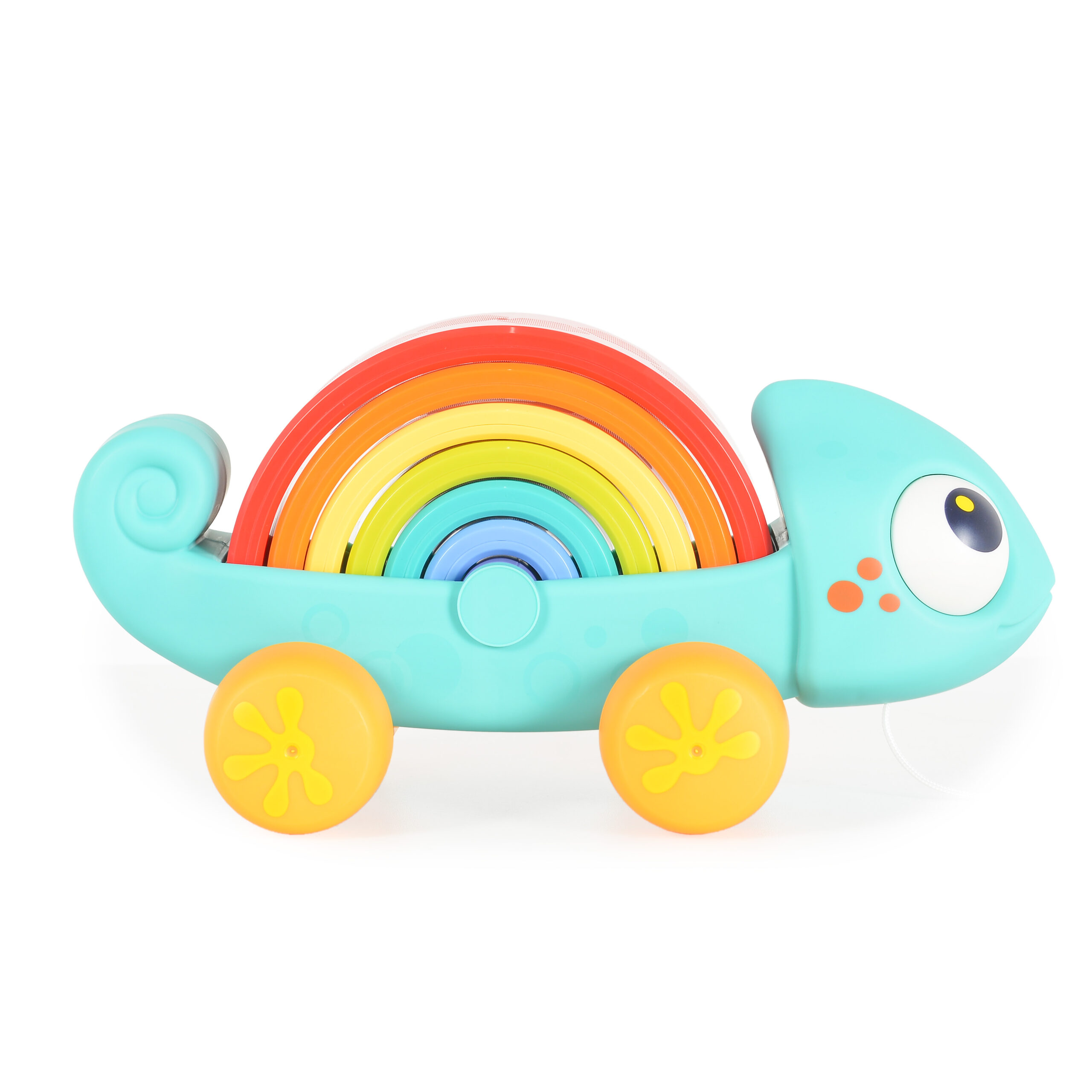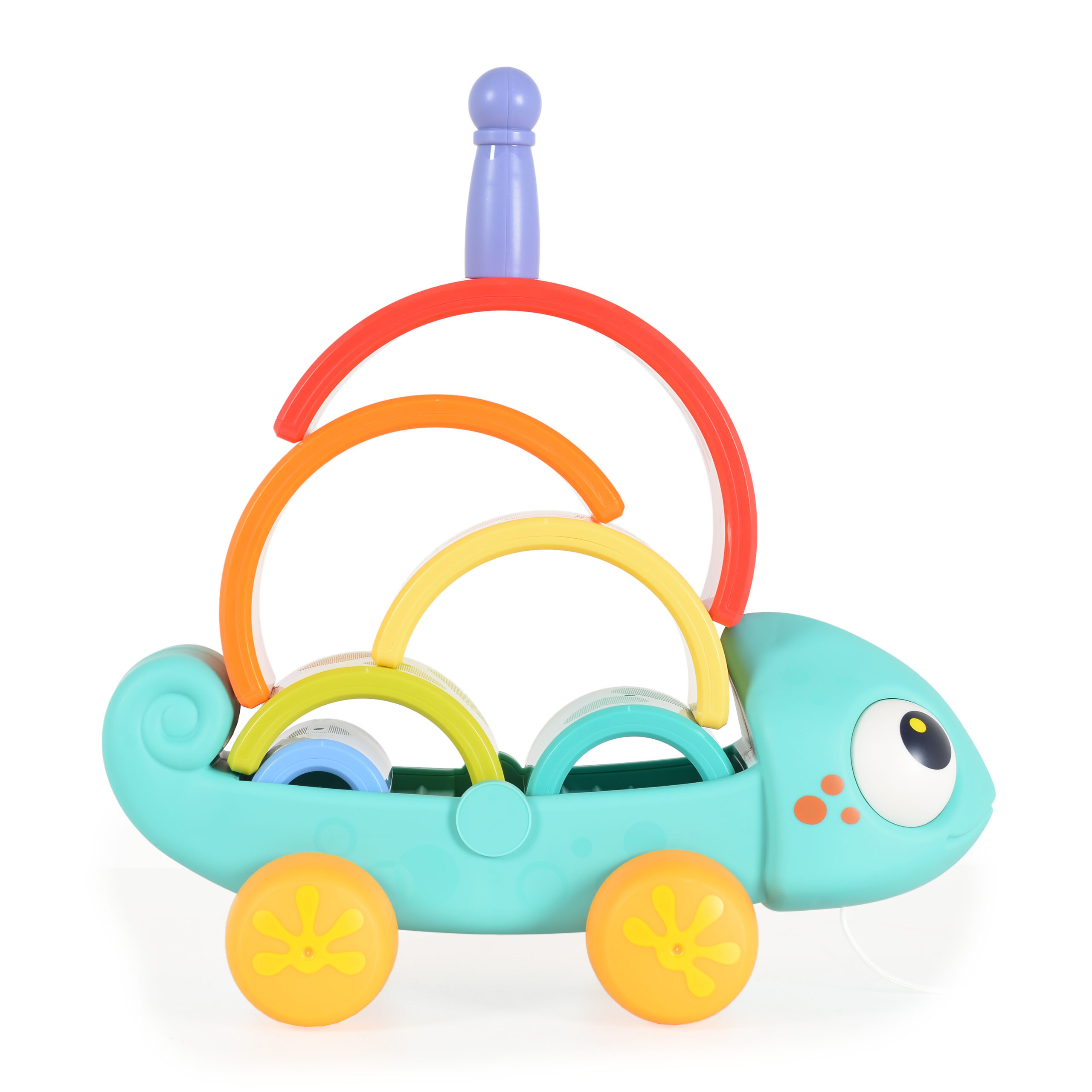 Весел и цветен хамелеон от Hola Toys – идеален за първите стъпки на Вашето дете! Комбинира играчка за дърпане, пирамидка и конструктор в едно, стимулирайки моториката, координацията и въображението.