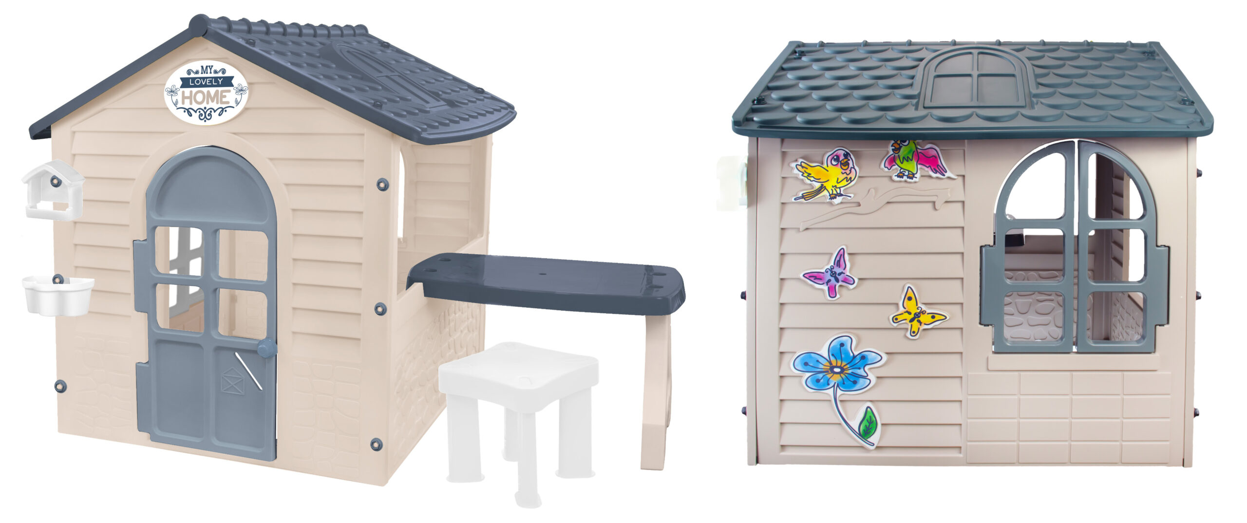 Забавна детска къща с маса и стол – перфектното място за игра! Вратата и прозорецът могат да се отварят и затварят, а комплектът включва маса, която се монтира на една от страните, столче и хранилка за птици. Изработена от безопасни материали и бои, къщичката е подходяща за деца над 12 месеца.