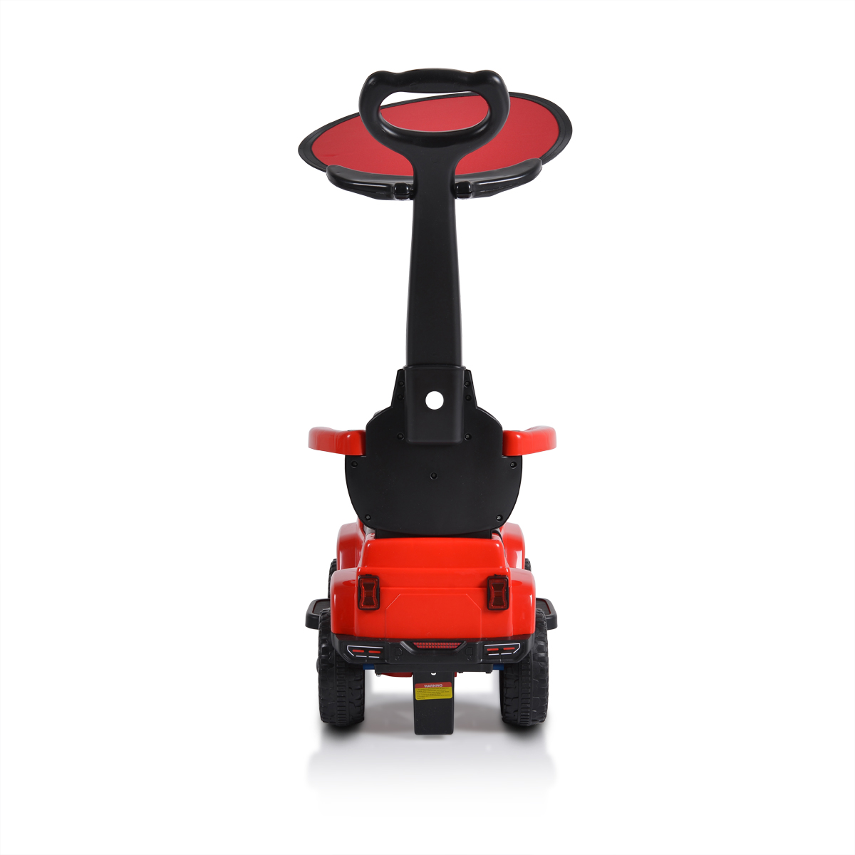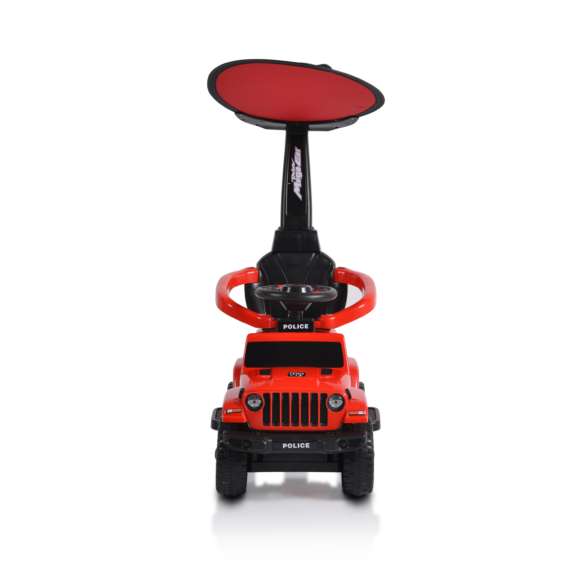 Детската пластмасова кола за яздене е с дизайн, който допринася за развитието на моториката и баланса на детето. Тя е със сваляеми дръжка за родителски контрол и сенник, сваляем преден предпазен борд и поставка за крачета за по – малки деца, удобни облегалка и седалка. Върху волана са разположени бутони за различни забавни мелодии. Музикалните функции се активират чрез батерии 3 x АА 1.5V батерии (не са включени).