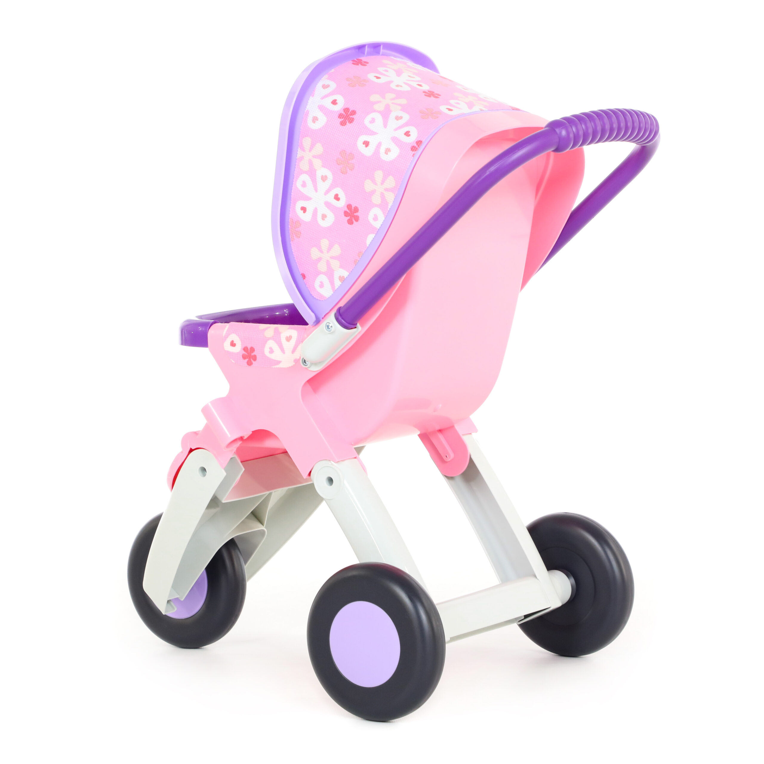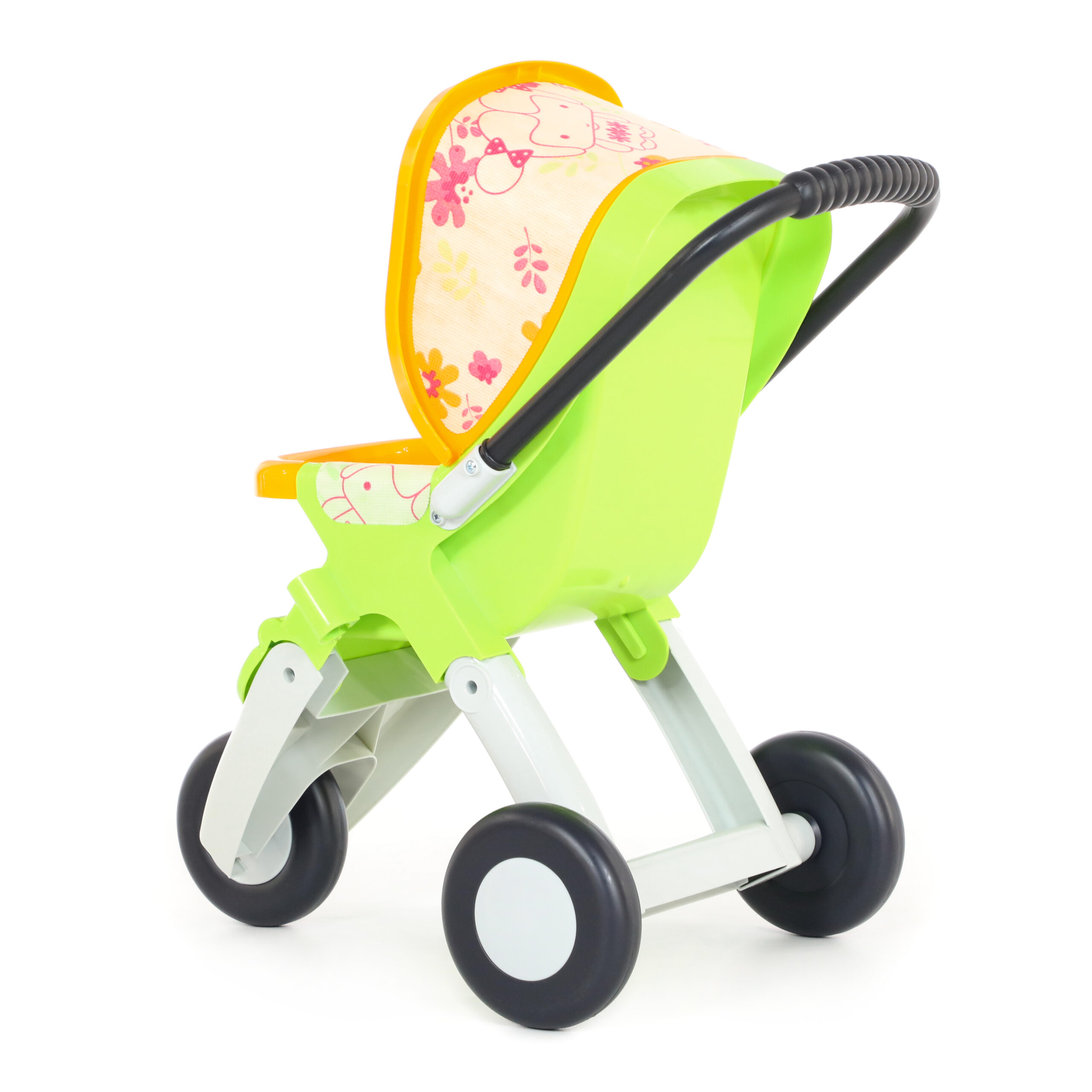 Традиционна триколесна детска количка за кукли с неплъзгащо покритие, което предпазва играчката поставена вътре от падане.